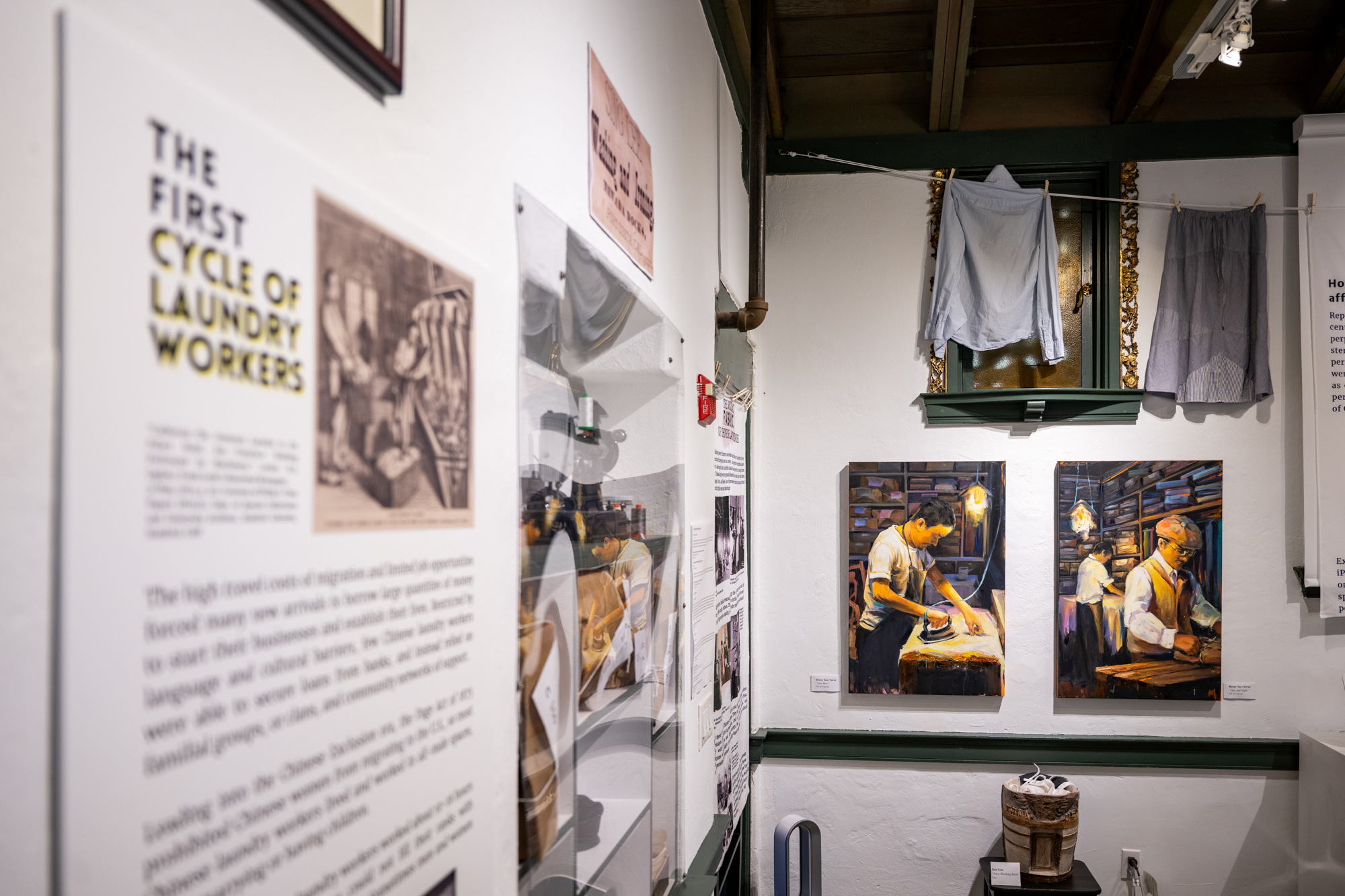 The exhibit Challenging a White-Washed History at the Chinese Historical Society of America Museum in San Francisco on July 31, 2025. The exhibition explores the history of Chinese laundries and their role in resisting discrimination and shaping immigrant labor in the U.S. (Beth LaBerge/KQED)
