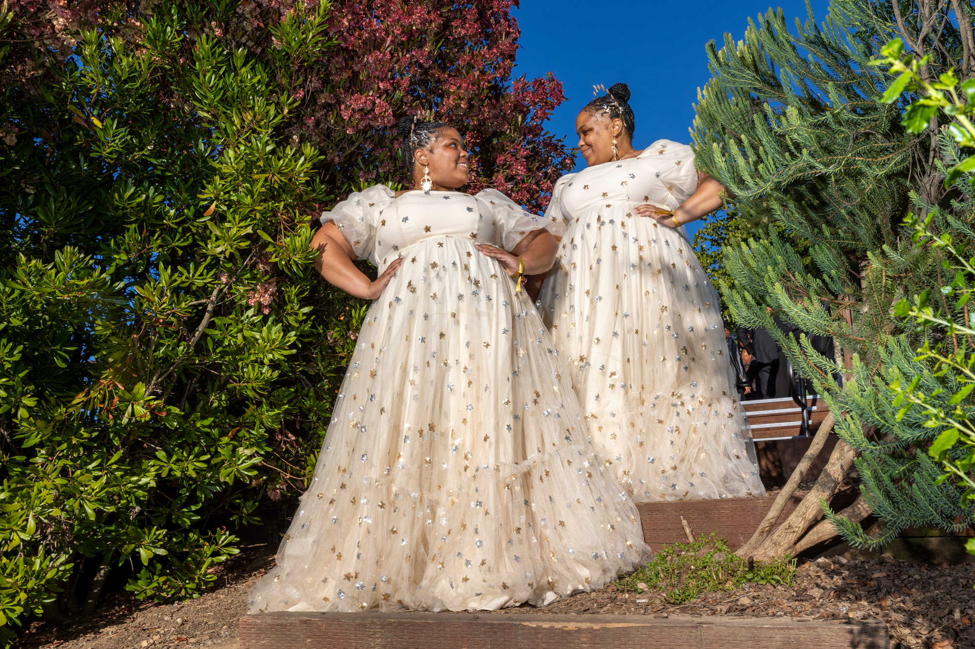 Charlene Richardson (left) and Charlette Richardson (right), also known as The LoveLove Twins, pose for a portrait at the Black Futures Ball hosted by The East Oakland Youth Development Center at Chabot Space and Science Center in Oakland on Aug. 2, 2025. (Tâm Vũ/KQED)