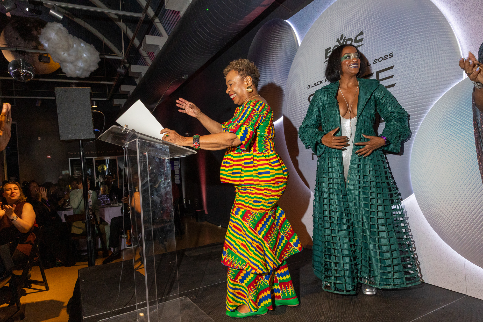 Oakland Mayor Barbara Lee walks up to the stage with a mayoral proclamation at the Black Futures Ball banquet hosted by The East Oakland Youth Development Center at Chabot Space and Science Center in Oakland on Aug. 2, 2025. (Tâm Vũ/KQED)