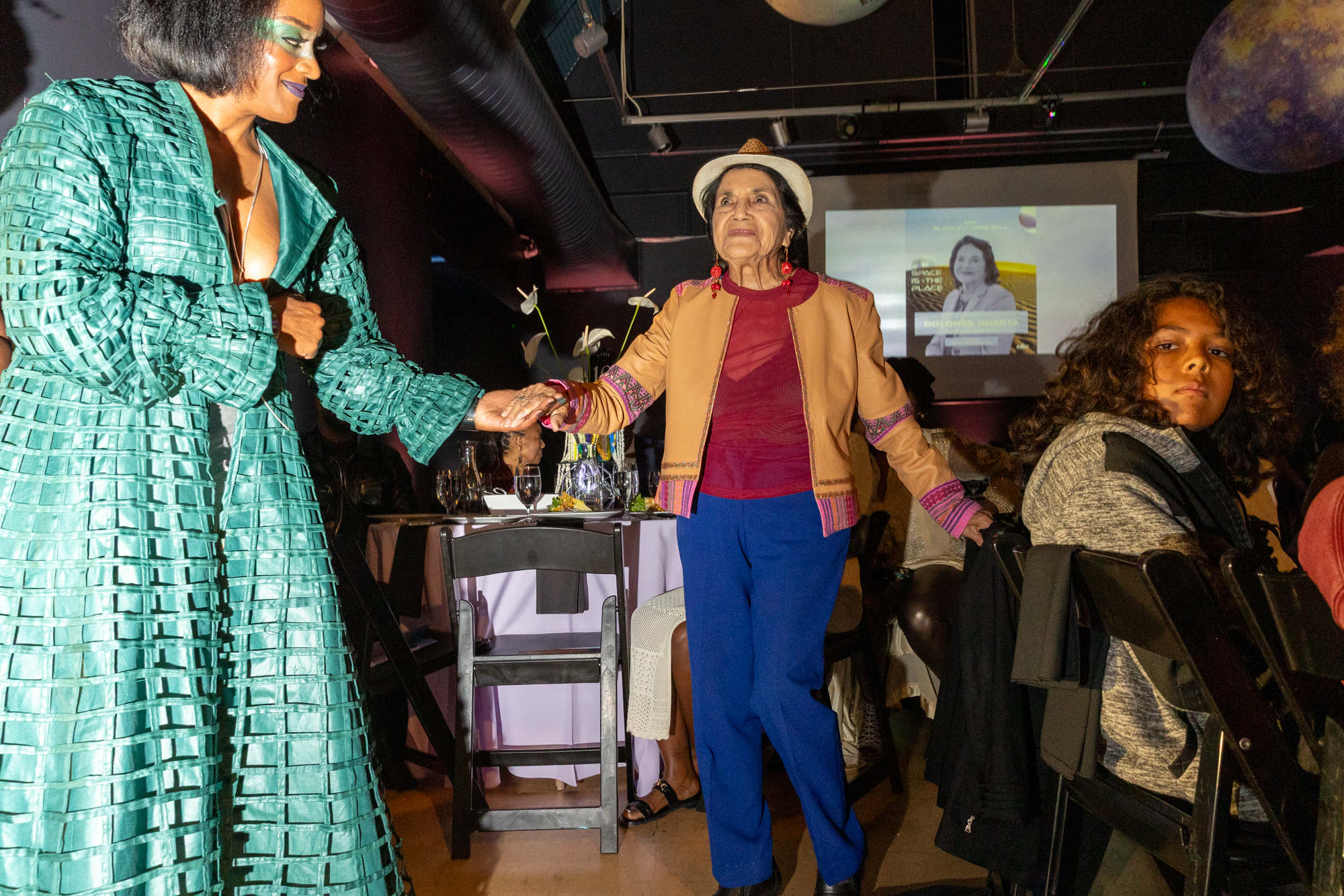Ryan Nicole Austin (left) helps Dolores Huerta (right) walk to the stage at the Black Futures Ball banquet hosted by The East Oakland Youth Development Center at Chabot Space and Science Center in Oakland on Aug. 2, 2025. (Tâm Vũ/KQED)