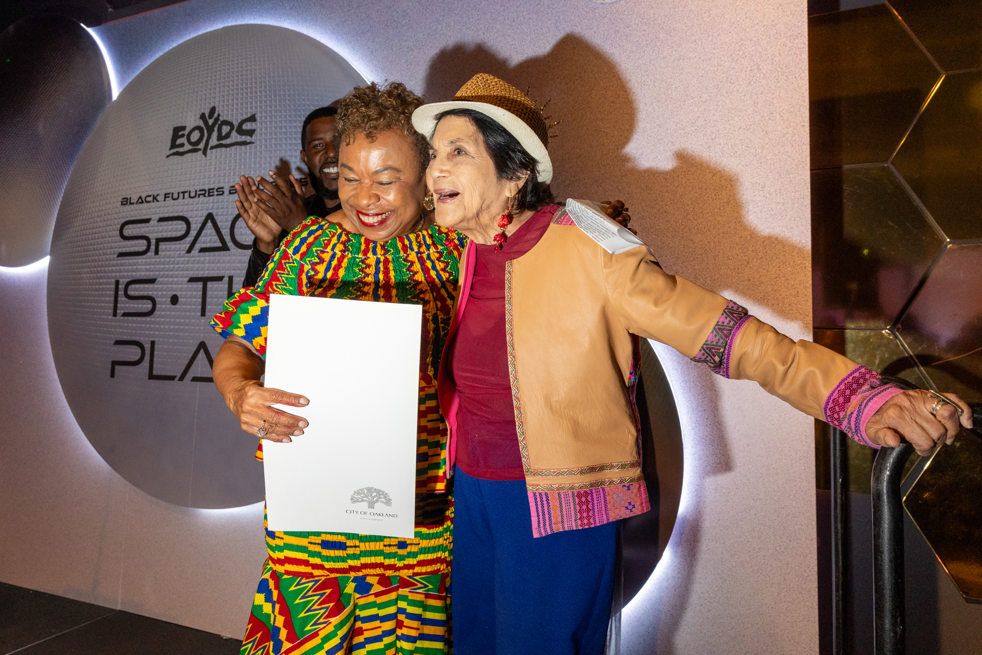 Oakland Mayor Barbara Lee (left) and Dolores Huerta (right) pose for a photo at the Black Futures Ball banquet hosted by The East Oakland Youth Development Center at Chabot Space and Science Center in Oakland on Aug. 2, 2025. (Tâm Vũ/KQED)