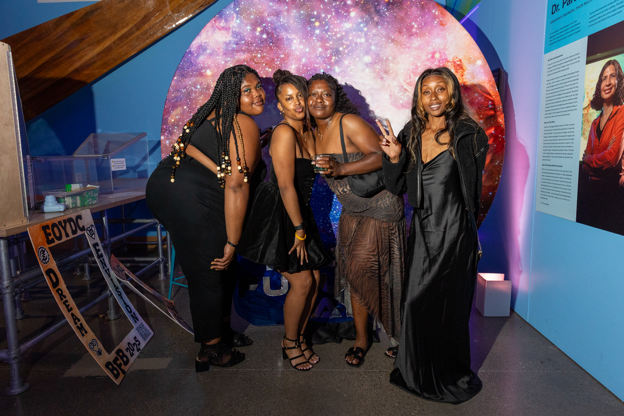 (L-R) Kahnetah Thomas, Shoshonie Torres, Erin Dixon, and Alexandria Rivera pose for a portrait together at the Black Futures Ball hosted by The East Oakland Youth Development Center at Chabot Space and Science Center in Oakland on Aug. 2, 2025. (Tâm Vũ/KQED)