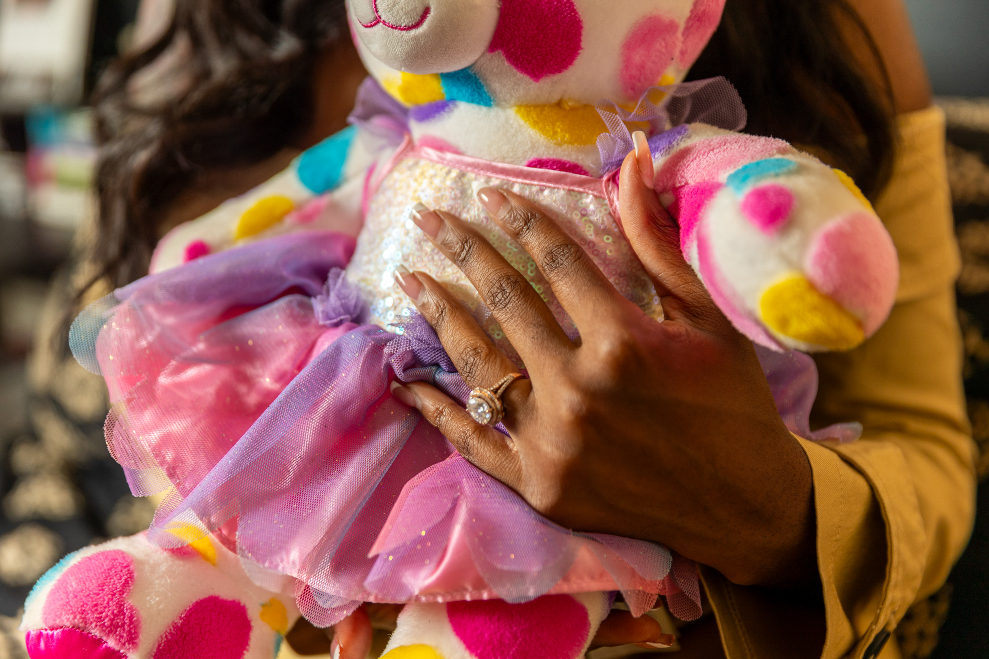 Shanice Robinson holds a Build-A-Bear that contains a recorded voice message from her husband, Joe ‘Fatter’ Blacknell, who is incarcerated, in her Richmond bedroom on August 6, 2025. Shanice Robinson, who is a visiting assistant professor at San Francisco State University, a teacher for incarcerated people, and an author of “Gangster’s Scholar: Love Behind Bars”, works to advocate for those affected by the prison system. (Tâm Vũ/KQED)
