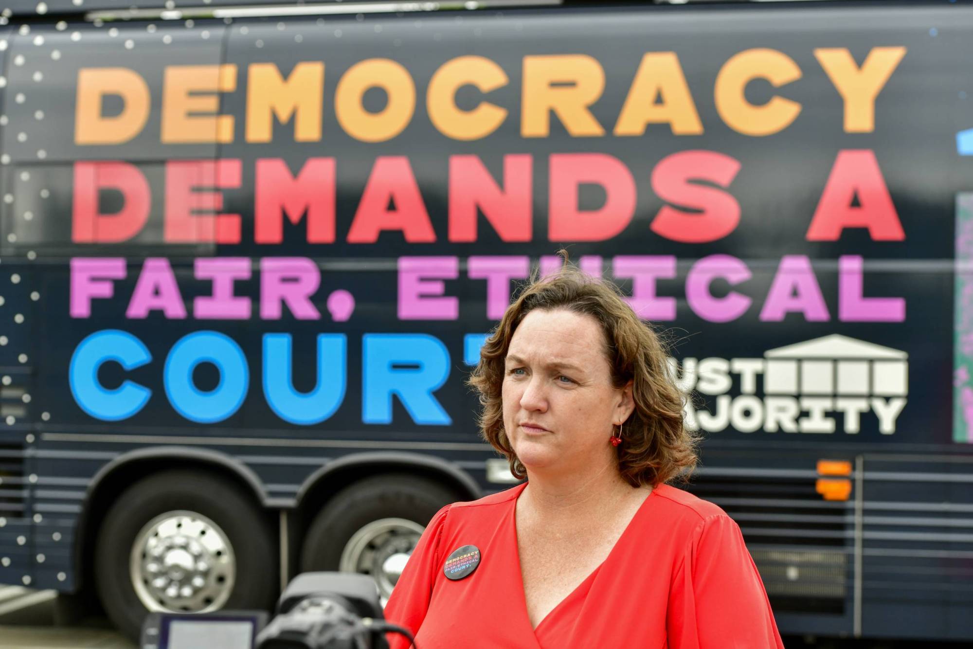 Rep. Katie Porter now sits in the frontrunner’s seat in the race to replace Gov. Gavin Newsom. (Jerod Harris/Getty Images for Demand Justice)