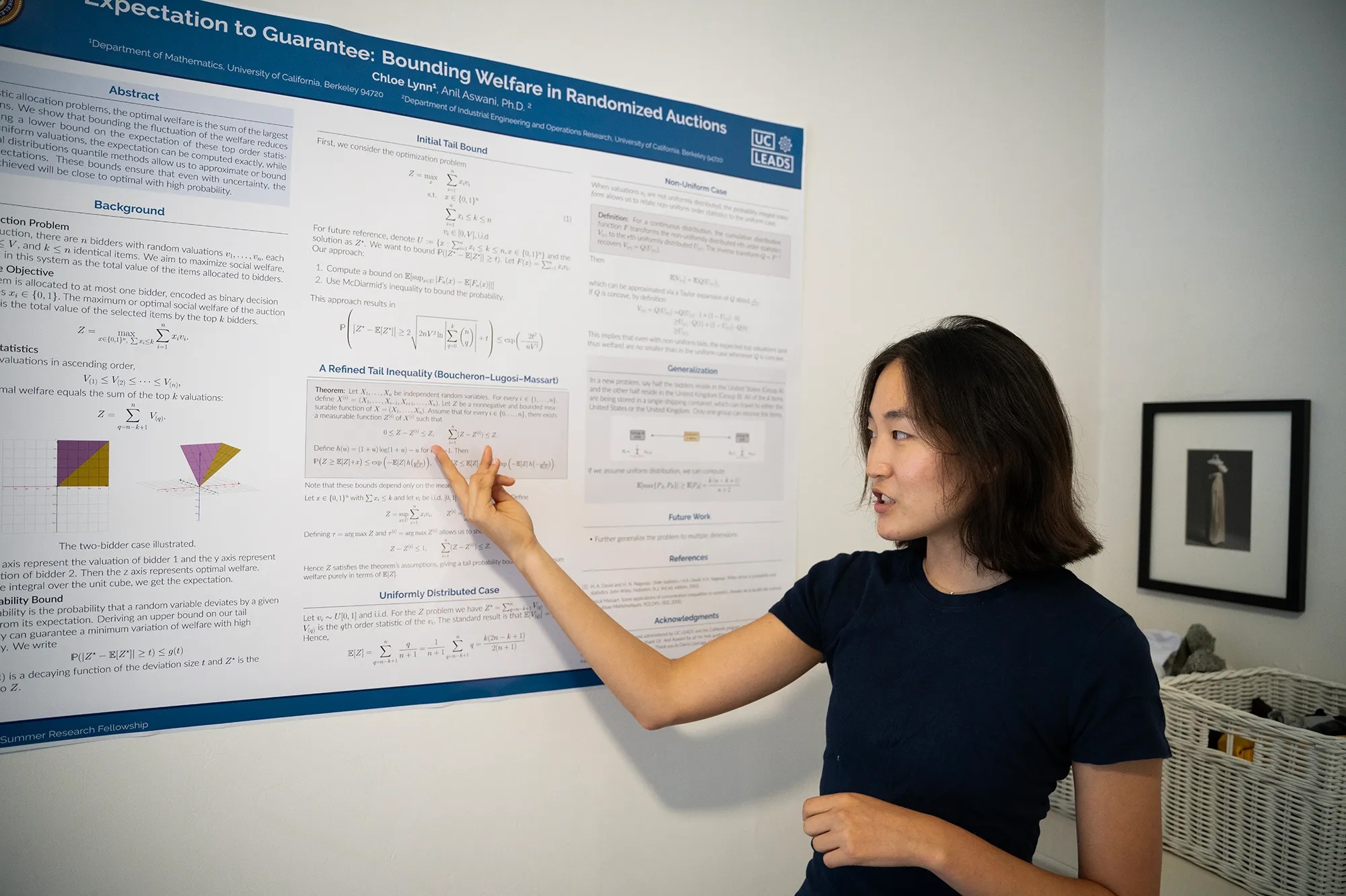 “Say you’re at an auction, and say there’s n bidders and k identical items,” she said as another student approached. Over the next two hours, fellow mathematicians, classmates, friends and family stopped by, listening as she explained her formula for allocating resources in an optimal way. Some understood her work and asked questions about her variables, formulas or 3-D models. The rest nodded in admiration.