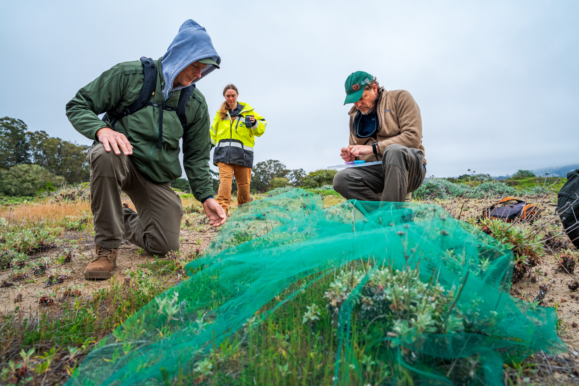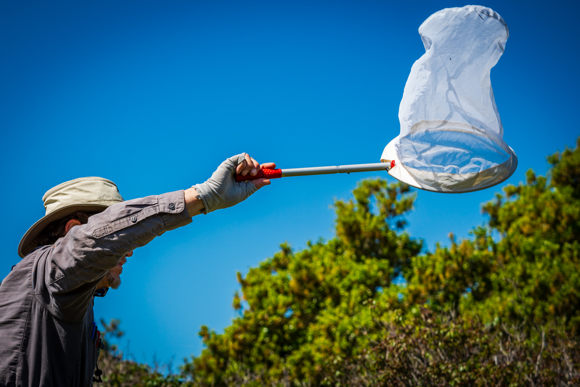 Lew Stringer: We go out and swipe nets in the air and capture them. And then we put them on ice, basically, or not exactly ice, but a cool environment where we feed them Gatorade in order to survive their transport back and to the release site here in the Presidio.