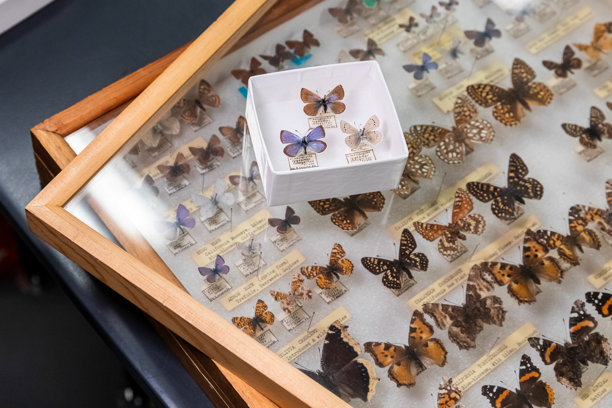 Chris Grinter: So this is an entire drawer full of butterflies. The females are more brown, so they have a little bit of blue towards the center of the body, and then a white fringe around the outside.