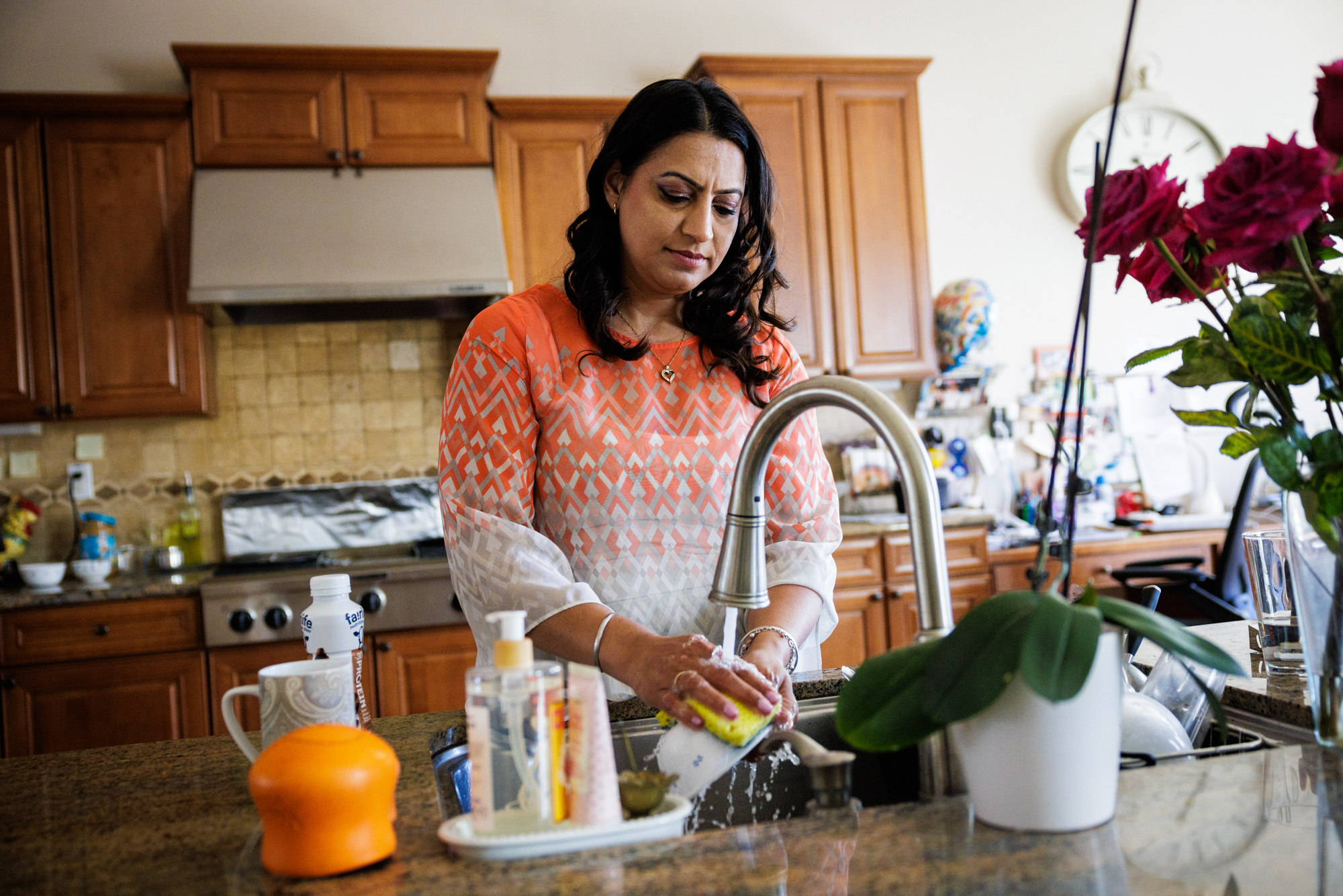 Jagbir Kang washes the dishes at her home in Fremont on July 25, 2025. (Martin do Nascimento/KQED)