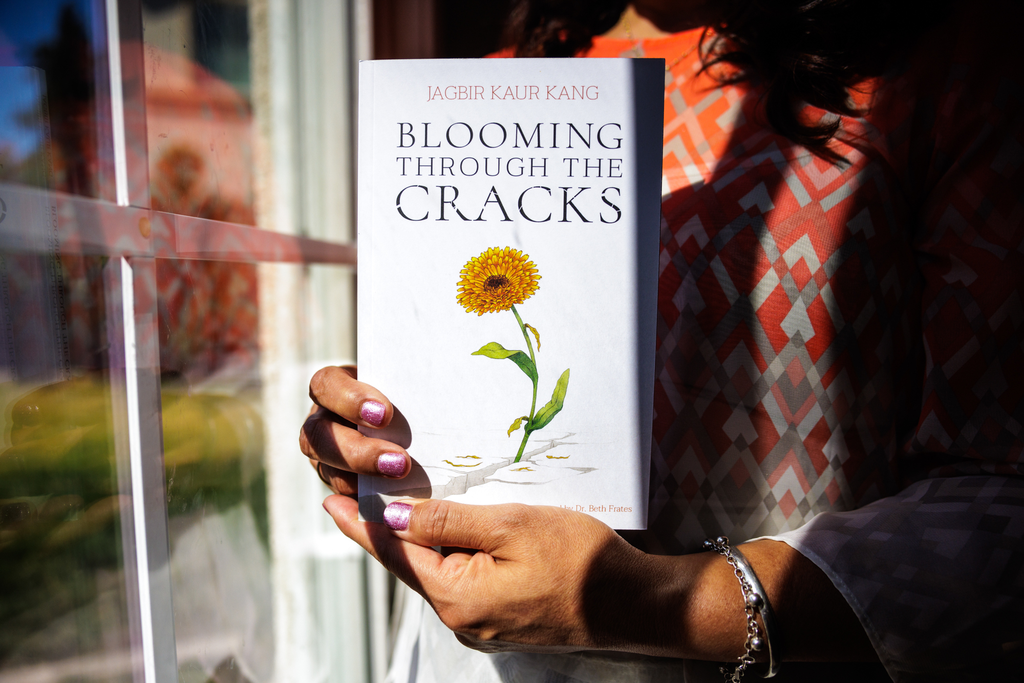 Jagbir Kang holds her book at her home in Fremont on July 25, 2025. (Martin do Nascimento/KQED)