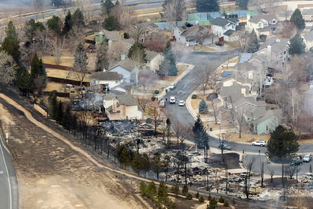 VOC contamination tends to occur in areas where water systems lose pressure and structures connected to the water system are damaged. Photo from a flyover of neighborhoods affected by the Marshall Fire. (Courtesy Hart Van Denburg/Colorado Public Radio)