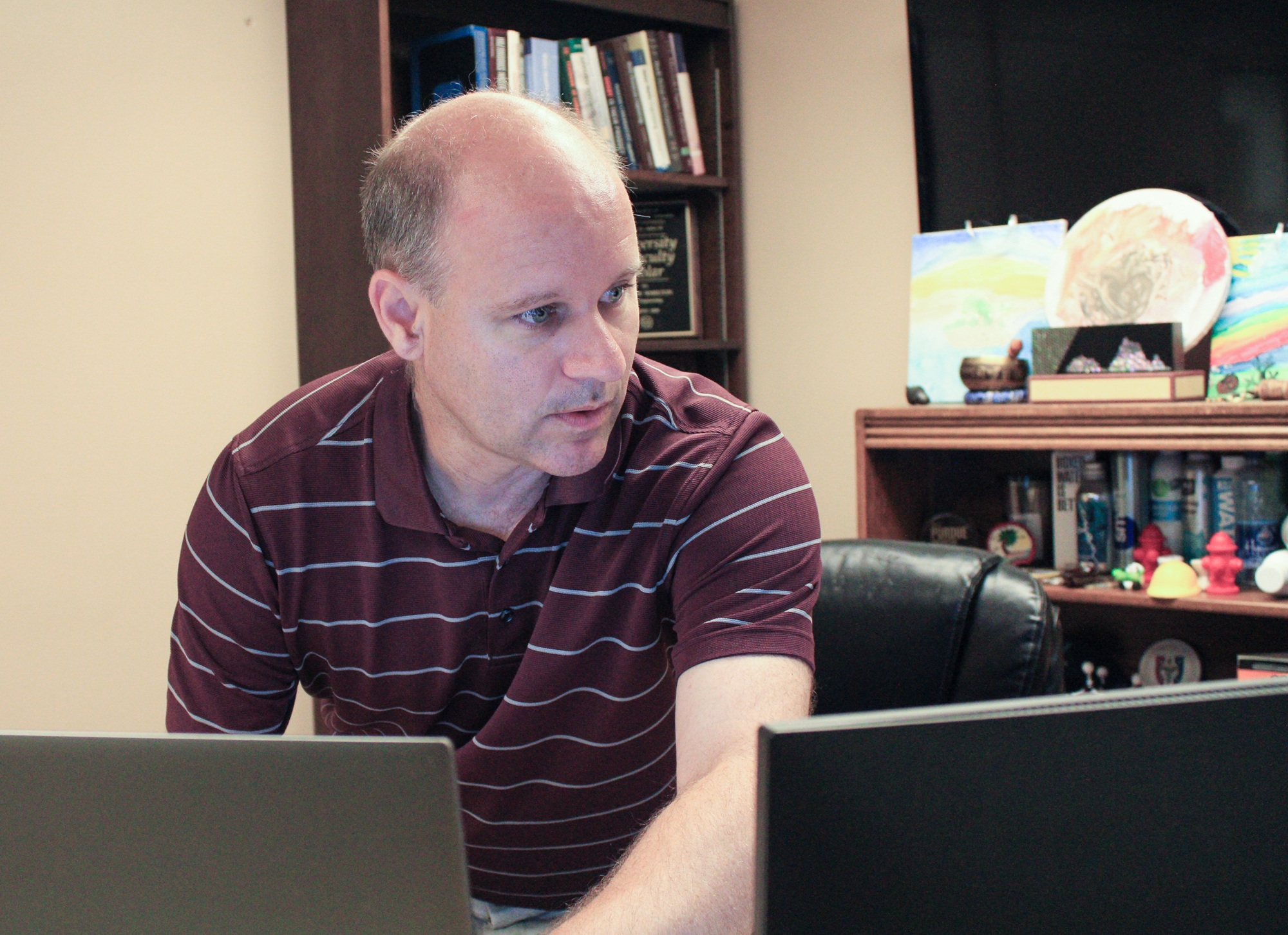 Purdue professor Andrew Whelton in his office on the school’s campus. (Benjamin Thorp/APM Reports)