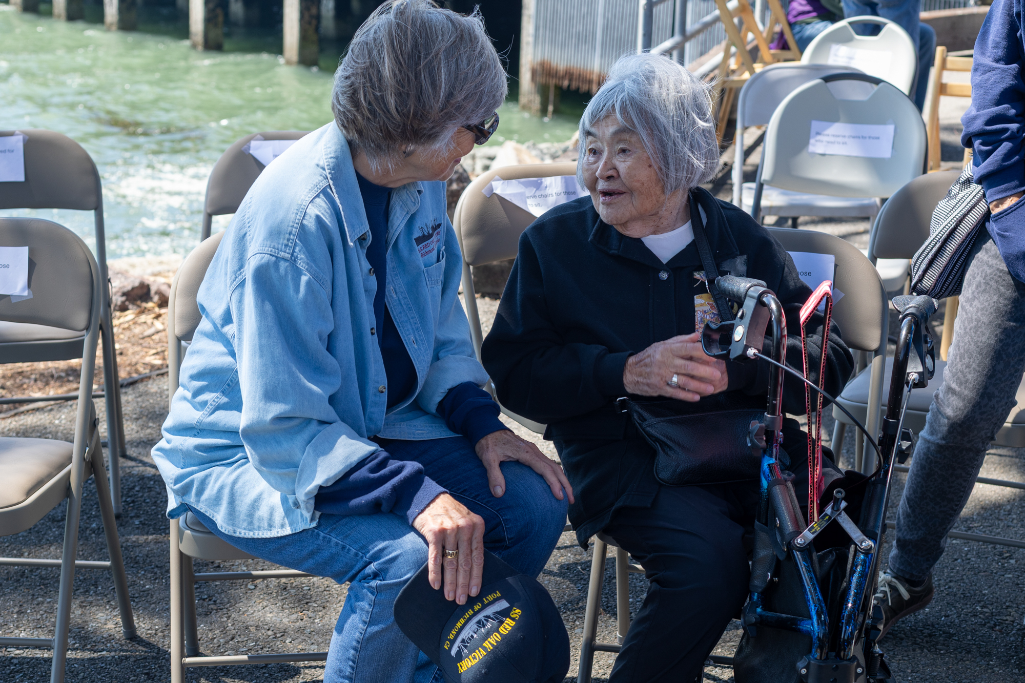 Flora Ninomiya (left), whose Japanese American family lost their Richmond home and business during World War II incarceration, converses with an event attendant during the National Park Service’s 109th birthday event at Rosie the Riveter/WWII Home Front National Historical Park on Aug. 25, 2025. (Gustavo Hernandez/KQED)