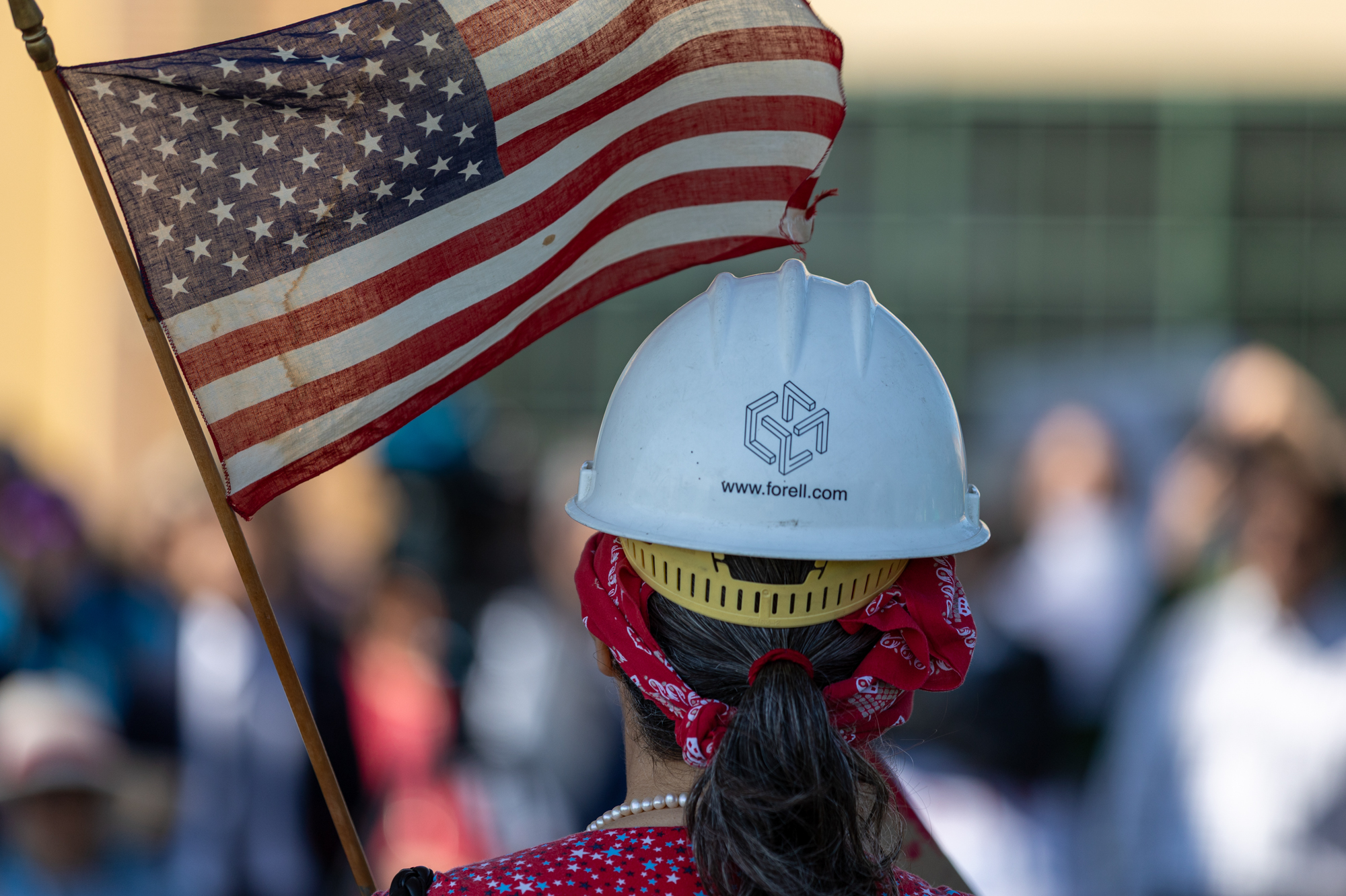 Kimberley Rodler (center right) cheers during the National Park Service’s 109th birthday celebration at Rosie the Riveter/WWII Home Front National Historical Park in Richmond, California, on Aug. 25, 2025. Rodler, who brought an American flag from her childhood in 1968 and her husband’s hard hat, said she made signs that morning and came to support the event. (Gustavo Hernandez/KQED)