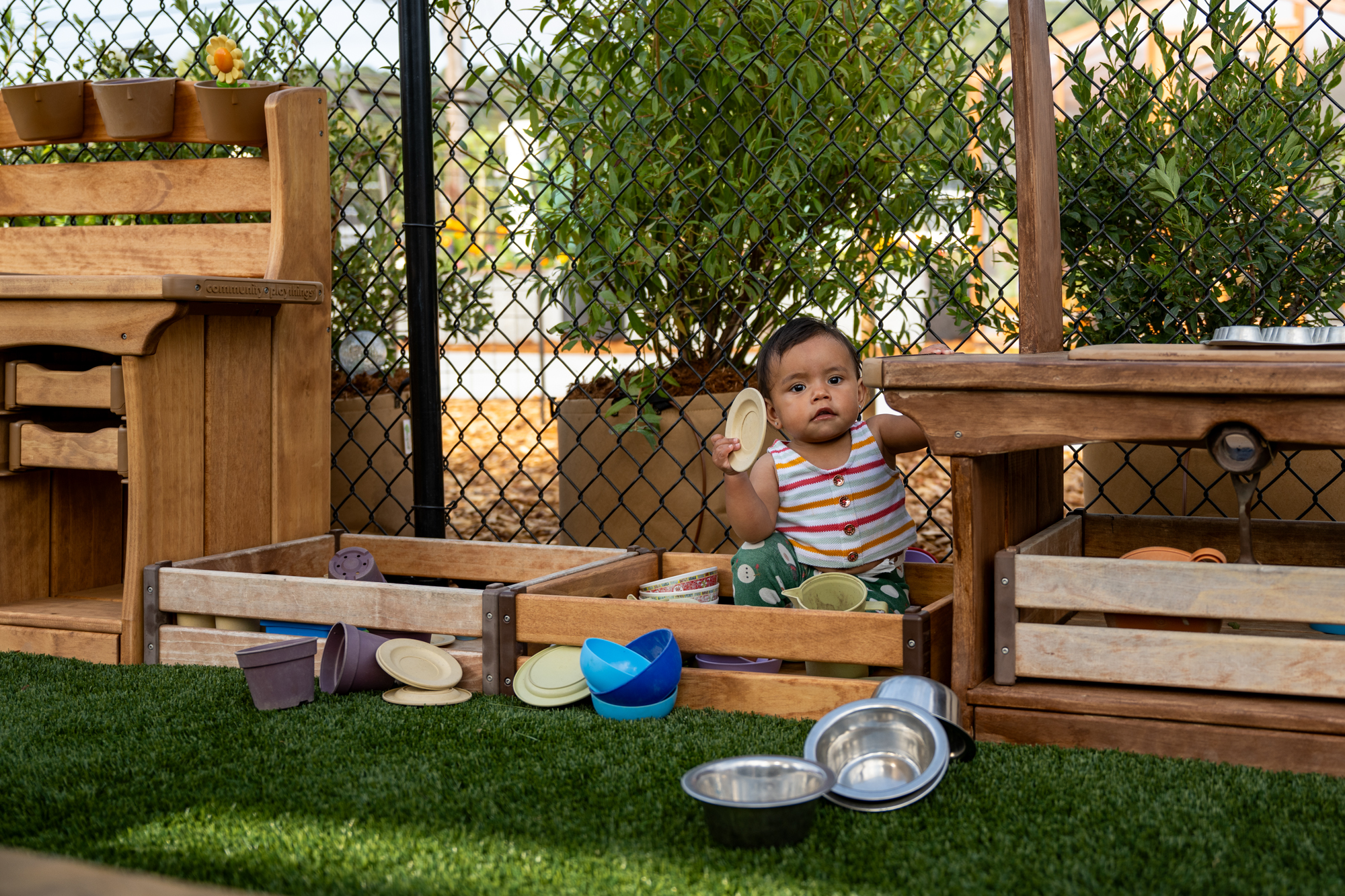 A child from the infant program plays in the outdoor area at the North Bay Children’s Center in Novato on Aug. 27, 2025. (Beth LaBerge/KQED)
