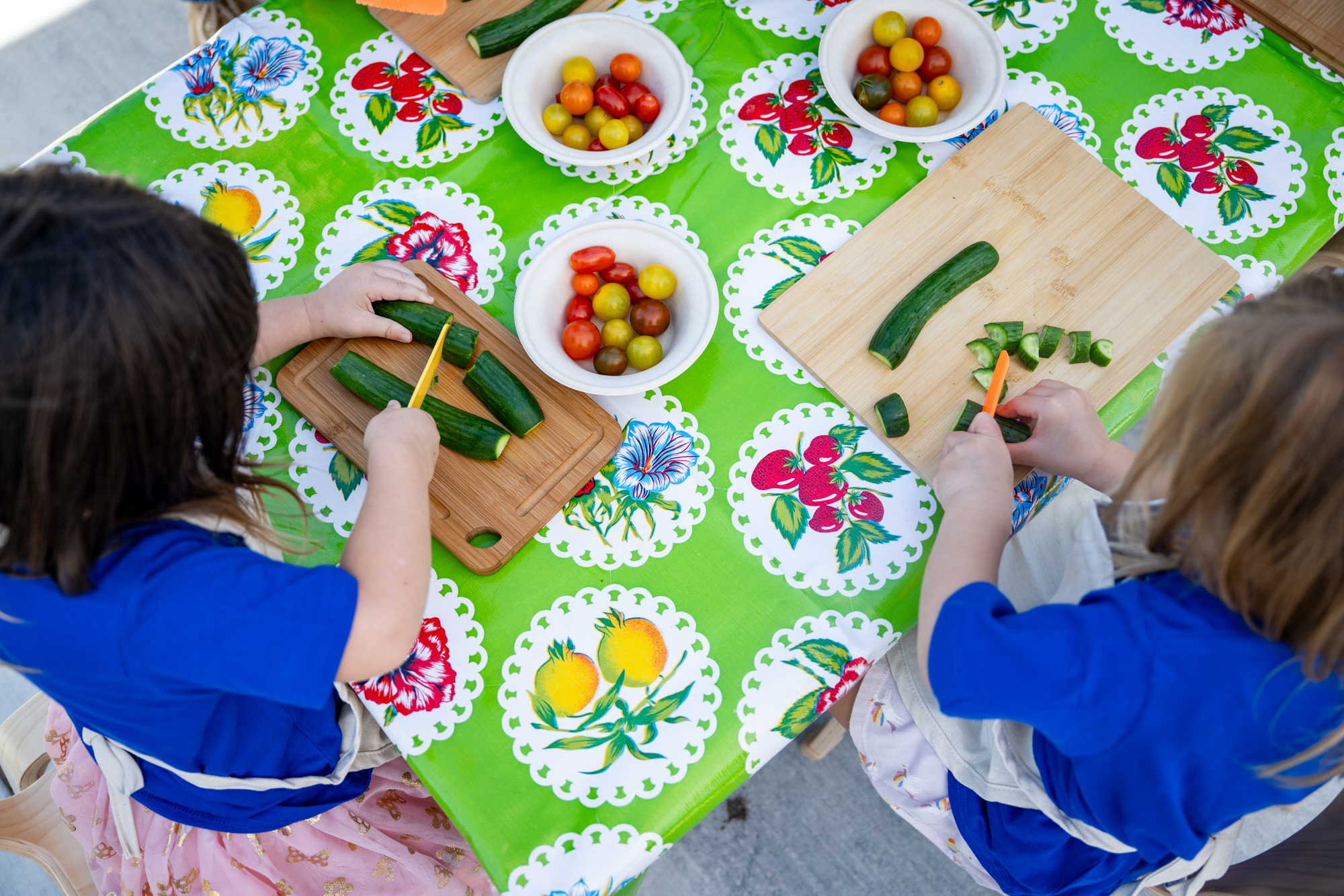 Students learn how to cut vegetables for a salad at the North Bay Children’s Center in Novato on Aug. 27, 2025. (Beth LaBerge/KQED)