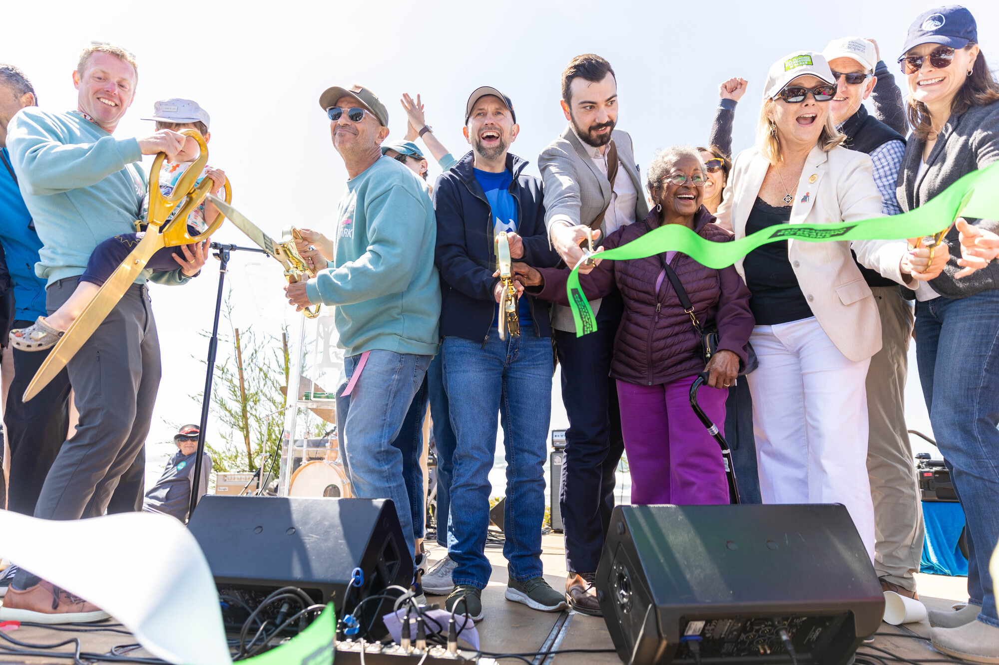Supervisor Joel Engardio, center, and other community leaders participate in the ribbon cutting during the Sunset Dunes Park grand opening on the Upper Great Highway in San Francisco on April 12, 2025. (Gina Castro/KQED)