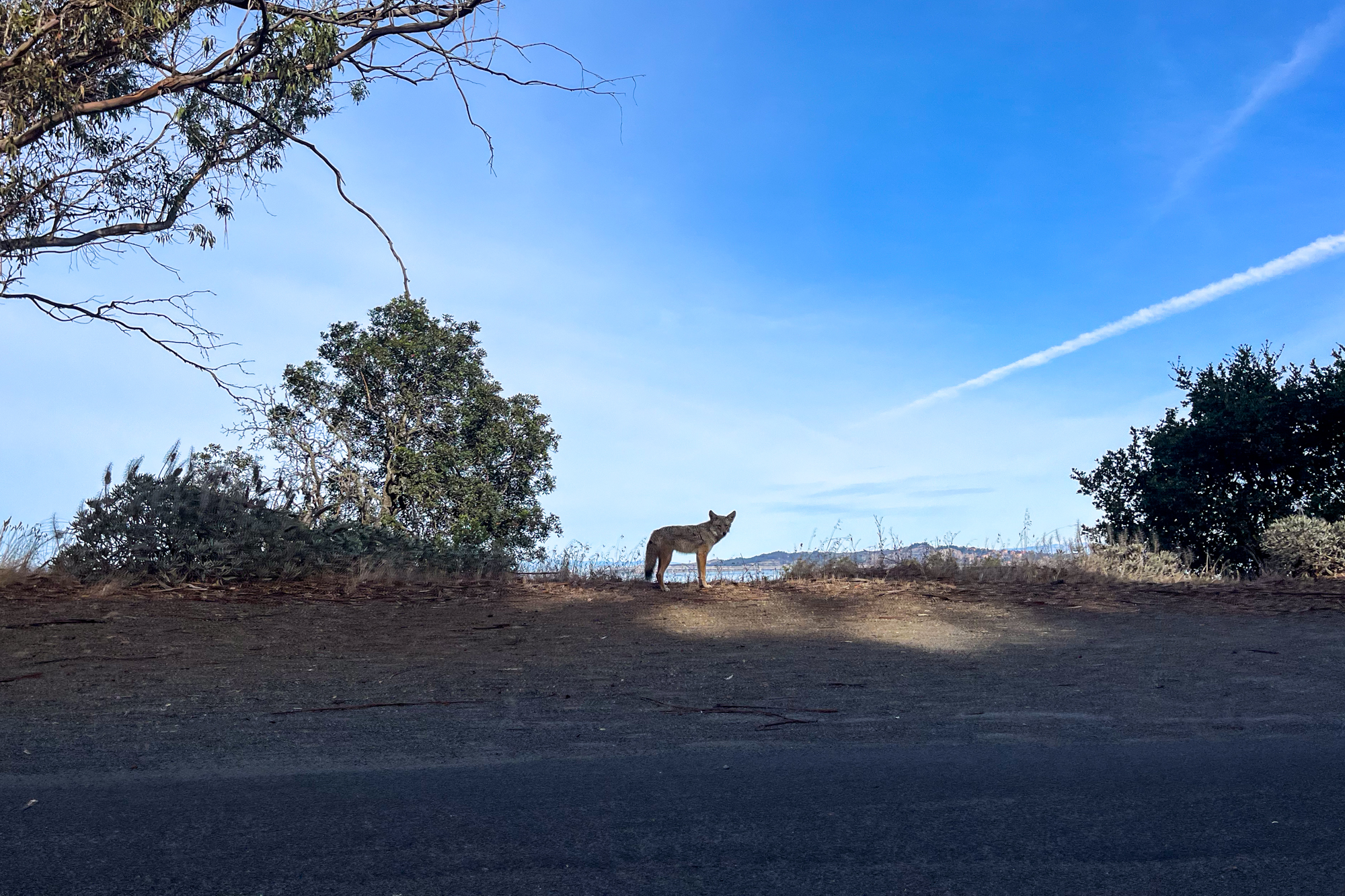 A coyote on Angel Island on Nov. 16, 2024. Coyotes have been living on the island in the San Francisco Bay since 2017, state parks staff say. (Courtesy of Casey Dexter-Lee/California State Parks)