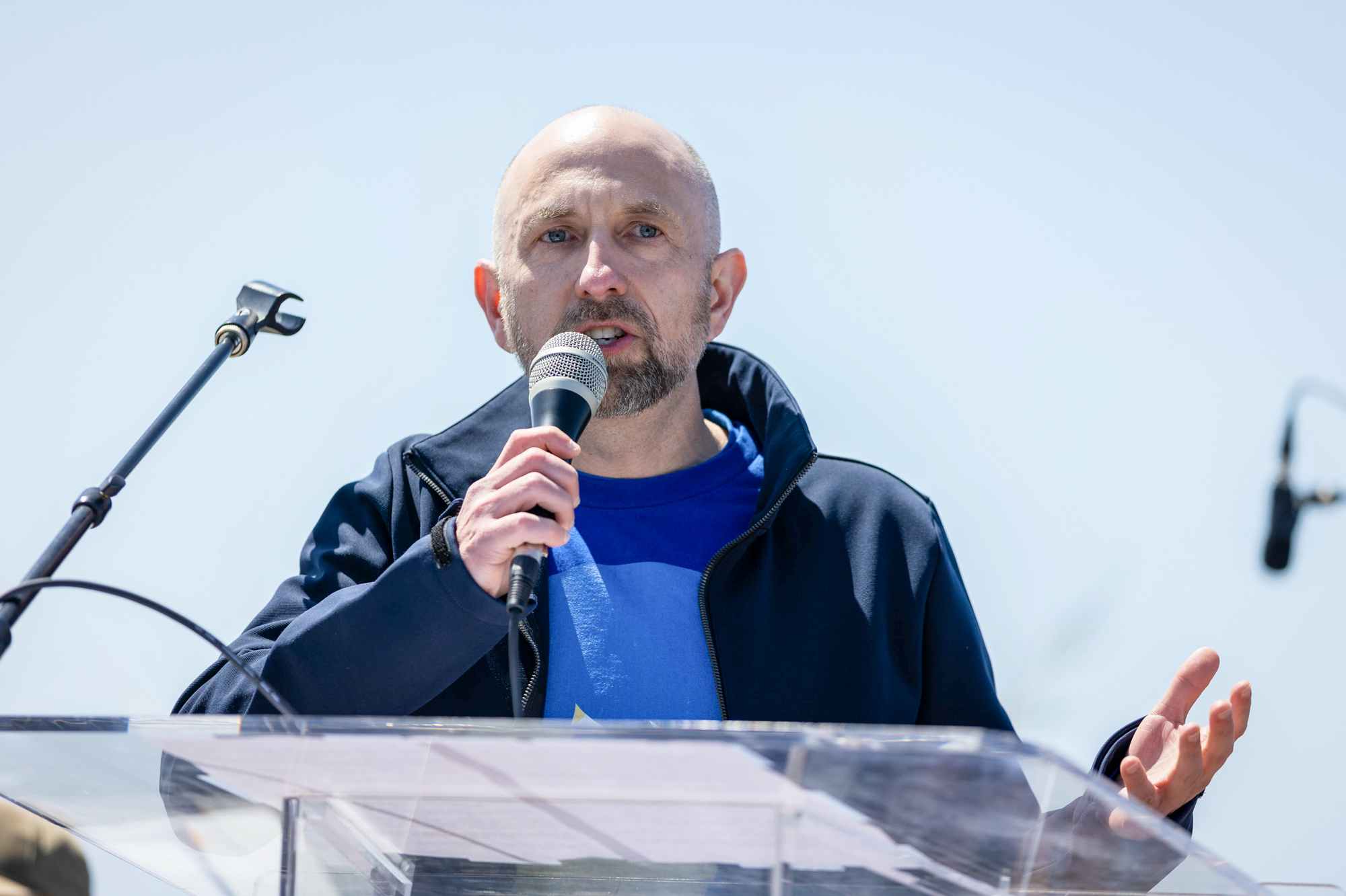 Supervisor Joel Engardio speaks during the Sunset Dunes Park grand opening on the Upper Great Highway in San Francisco on April 12, 2025. (Gina Castro/KQED)