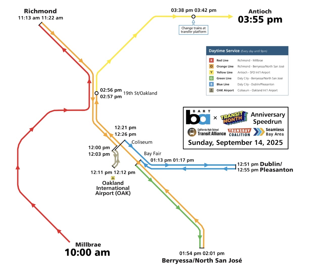 The BART speedrun takes place on Sunday, Sept. 14. The event will start at 9:40 a.m. sharp at the Millbrae BART station. For more information, visit: https://luma.com/yj73dmrc.