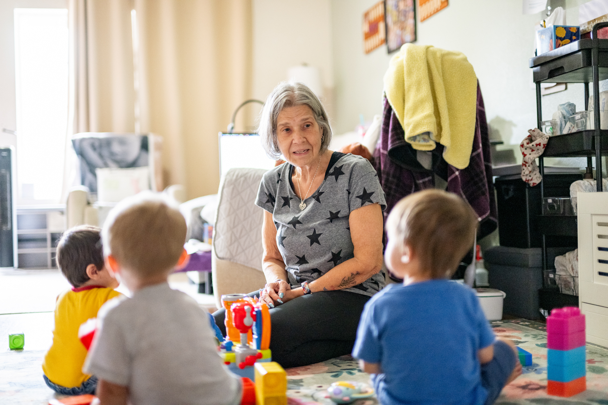 Lisa Zarodney sits with children at the day care center she runs from her home in Livermore on Sept. 11, 2025. (Beth LaBerge/KQED)