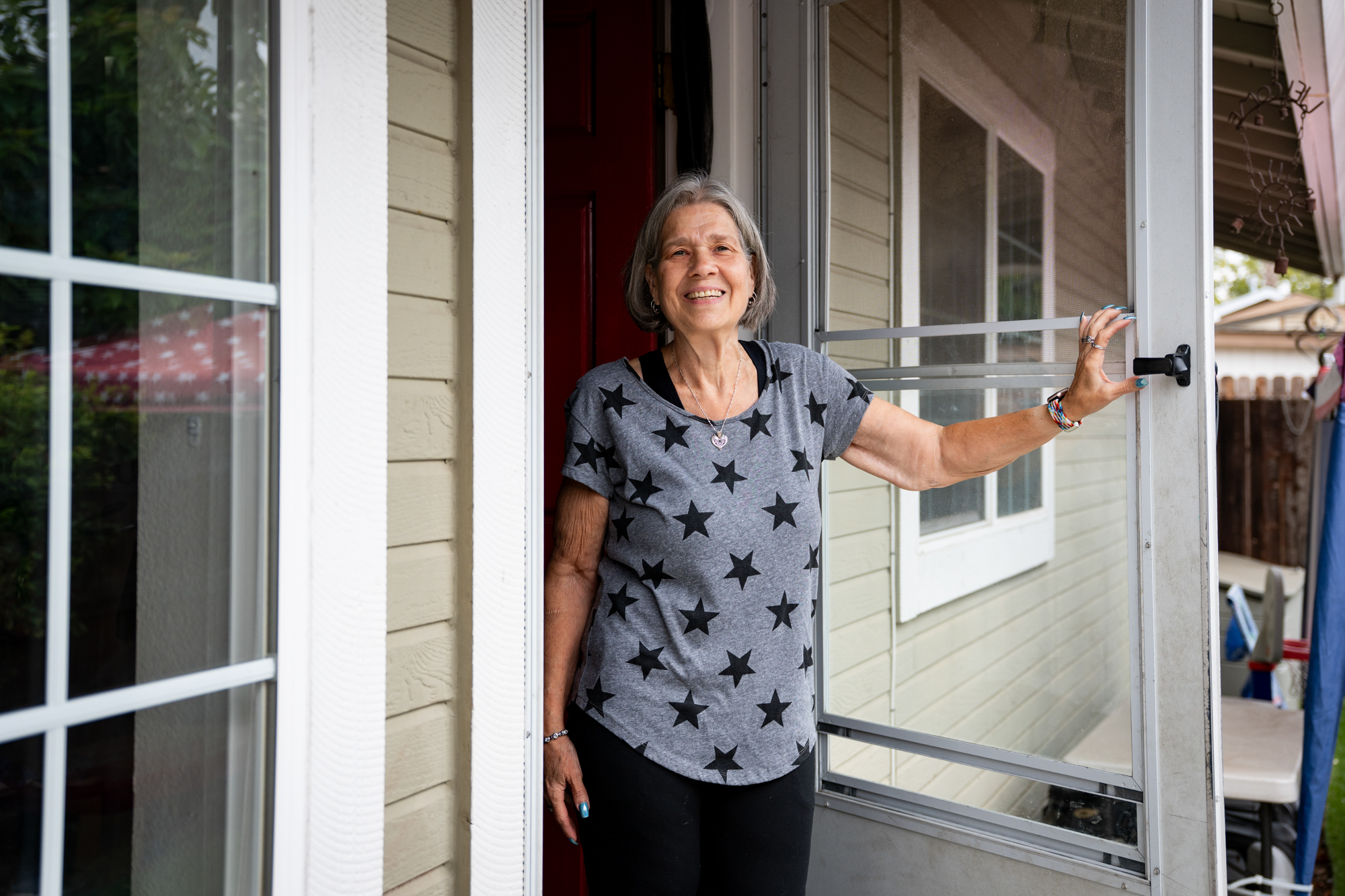 Lisa Zarodney stands in the doorway of the day care center she runs out of her home in Livermore on Sept. 11, 2025. (Beth LaBerge/KQED)