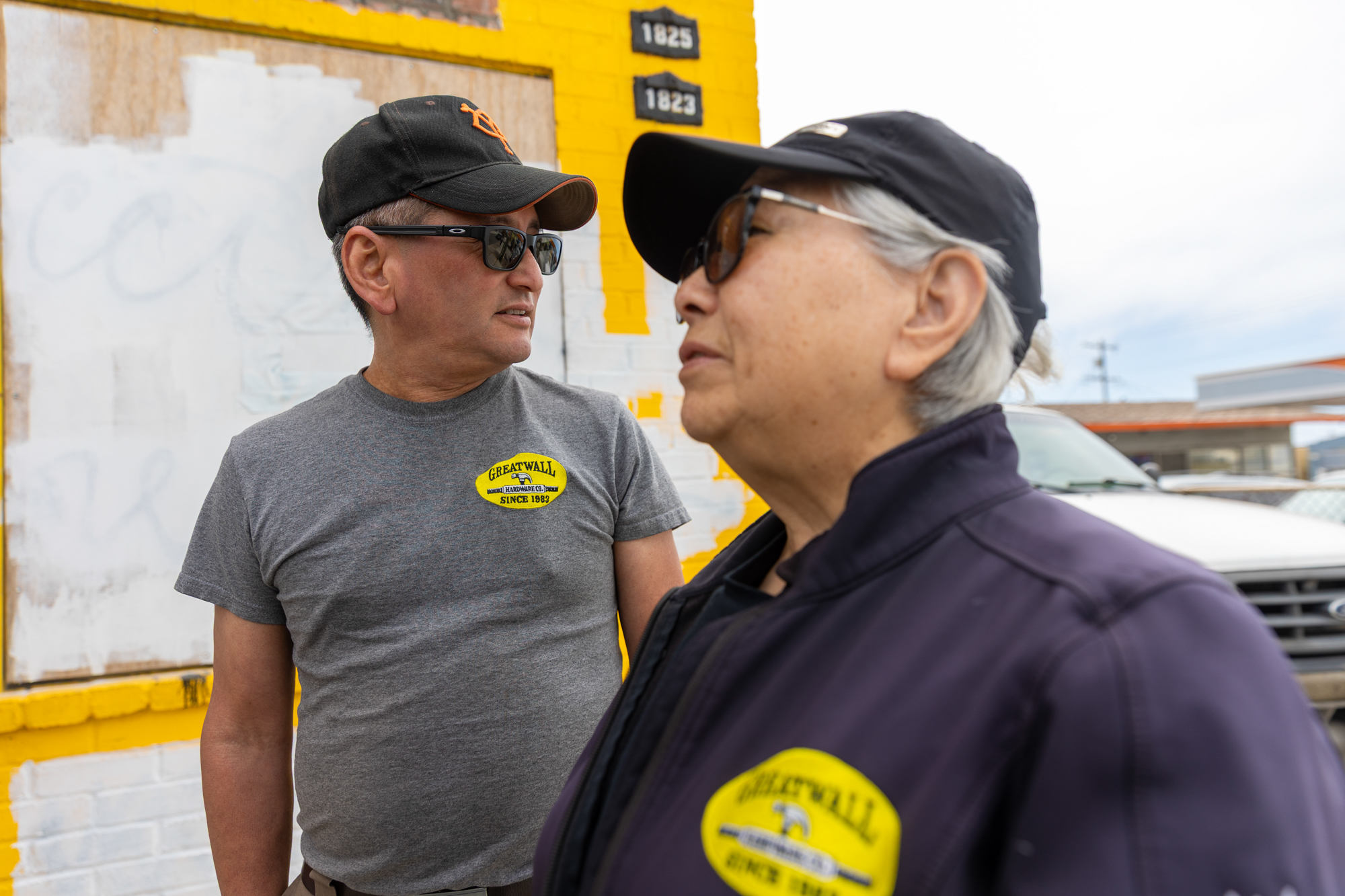 Albert Chow (left) and his mother, Mariana Chow (right), discussed the destruction of their business, Great Wall Hardware, by fire in the Sunset District, outside the store on Taraval Street in San Francisco on September 3, 2025. Chinese voters in the Sunset were divided over whether to support the recall of Supervisor Joel Engardio, who backed the proposal to close off the Great Highway to cars and open a new park. (Tâm Vũ/KQED)