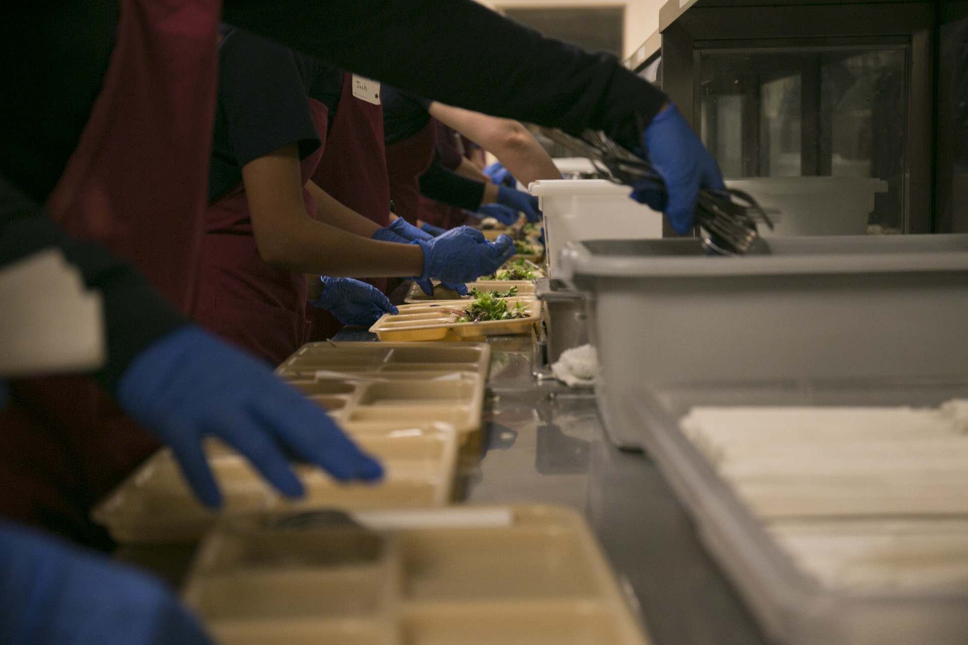 Volunteers pass trays down the cafeteria line at St. Anthony’s. (Anne Wernikoff/KQED)