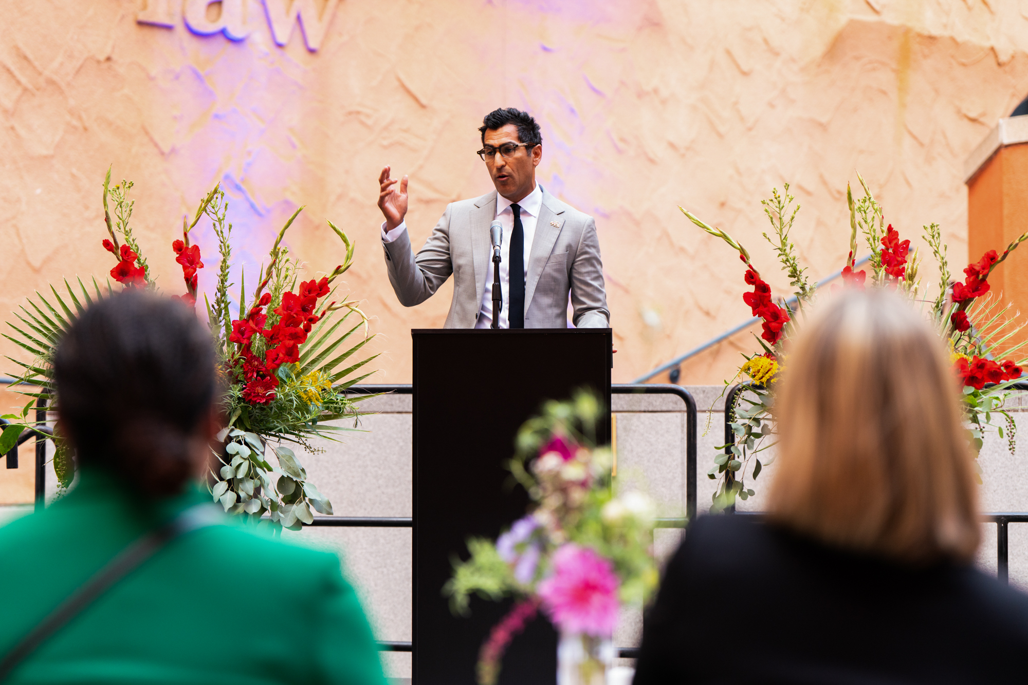 Assembly Speaker Robert Rivas delivers remarks during the reception for the late John Burton’s memoir, “I Yell Because I Care,” at the California Museum in Sacramento on Sept. 9, 2025. (Louis Bryant III for KQED)