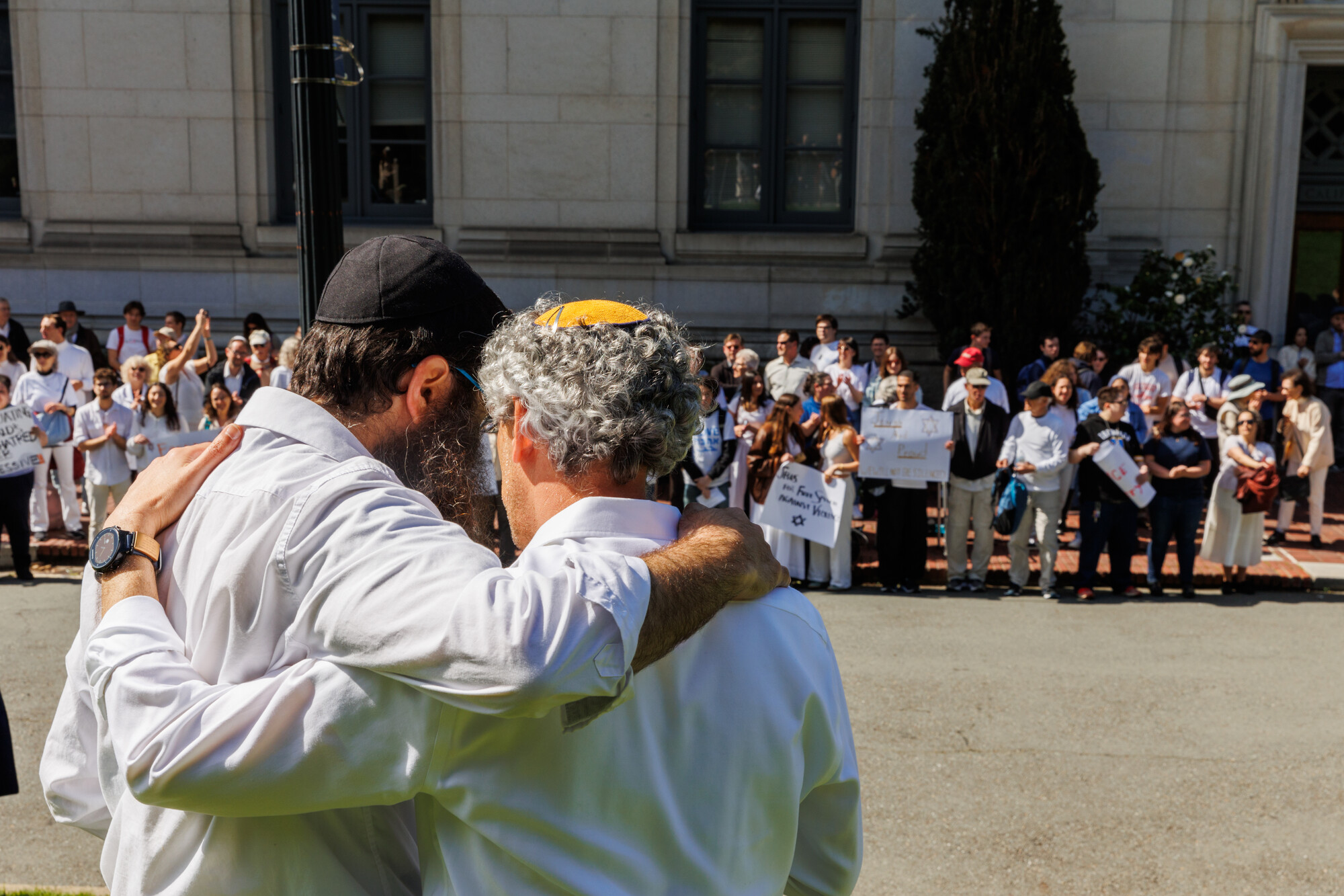 Rabbi Gil Leeds of Berkeley Chabad, left, and Rabbi Adam Naftalin-Kelman, executive director of Berkeley Hillel, right, embrace as Jewish Berkeley students, faculty and community members rally on campus in Berkeley, California, on March 11, 2024. The crowd of over 100 rallied to protest antisemitism and blockage of Sather Gate by pro-Palestinian and anti-Israel students, stating that the University had not been enforcing its policy of keeping the gate path clear. (Juliana Yamada for KQED)
