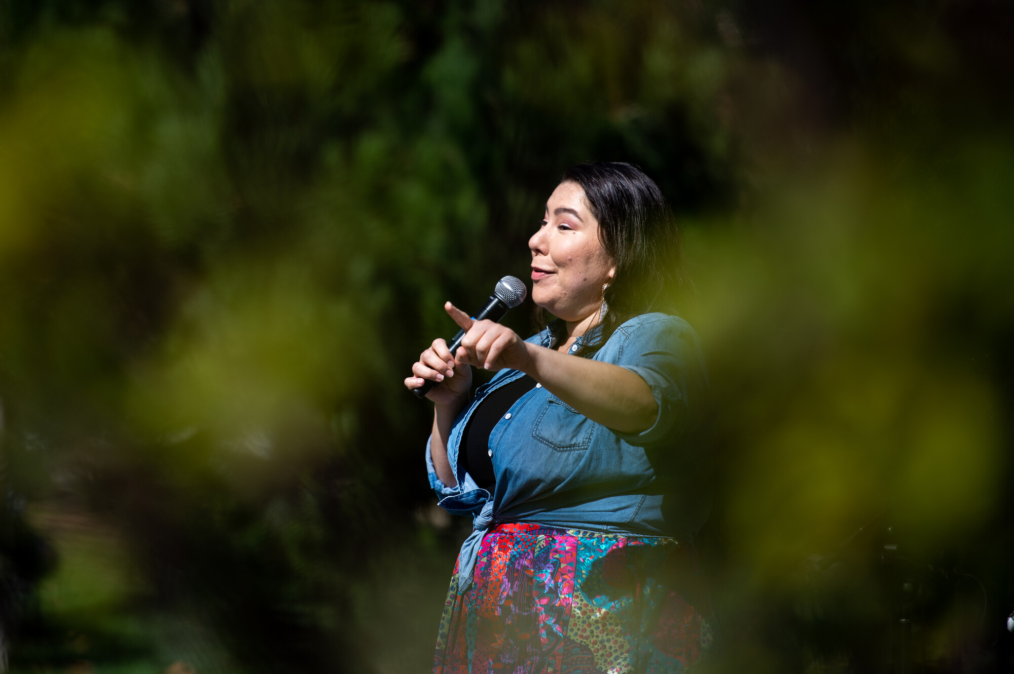 Comedian and emcee Jackie Keliiaa speaks during the 3rd annual Indigenous Peoples Day Commemoration at Yerba Buena Gardens in San Francisco on Oct. 11, 2021.
