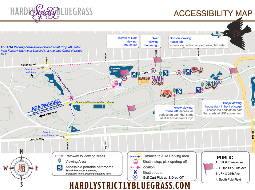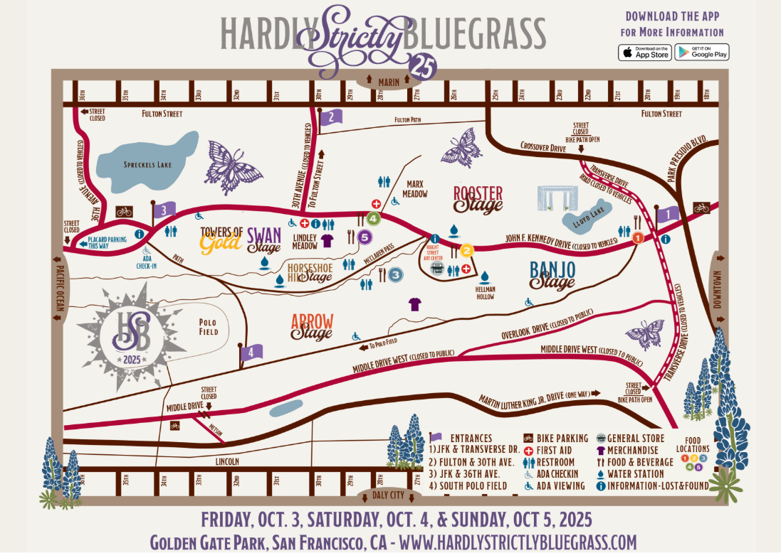 Guests who seek accessible services can get a wristband. The map below highlights the usual accessible services at Hardly Strictly, like entrances, viewing spots and accessible portable bathrooms.