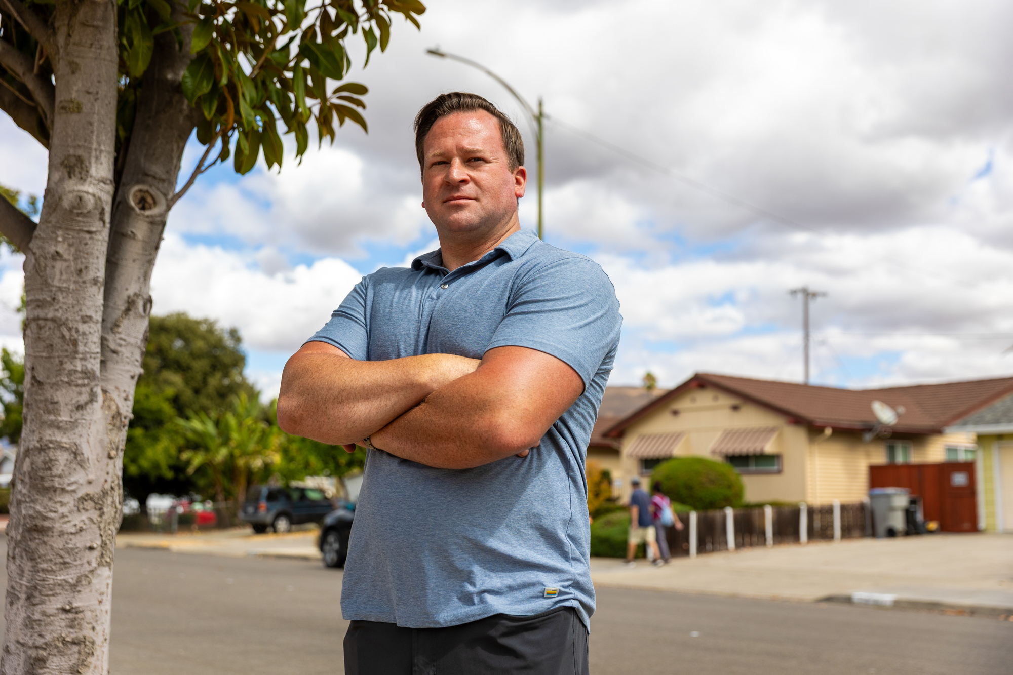 Justin Chaudoin, a parent who is vocal about the impact of school district changes on his child, poses for a portrait at Ruskin Elementary School in San José on Sept. 9, 2025. (Tâm Vũ/KQED)