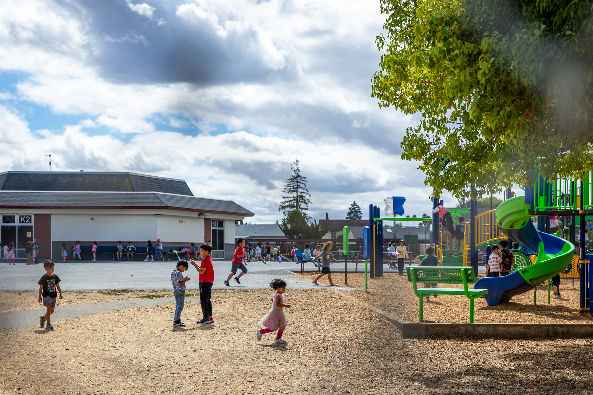 Children play at Ruskin Elementary School in San José on Sept. 9, 2025. Parents at Ruskin Elementary School in San José say school consolidations have caused chaos on campus, leading to unsafe traffic and hurried school lunches. (Tâm Vũ/KQED)