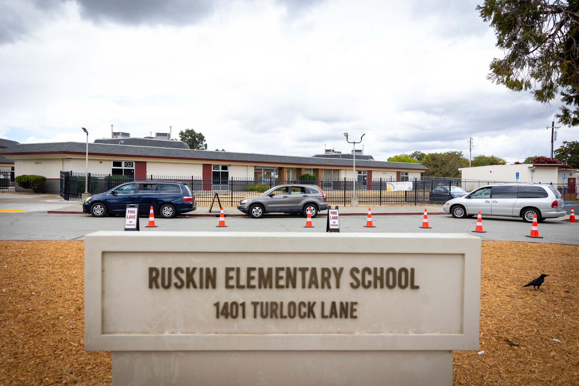 Ruskin Elementary School stands on 1401 Turlock Lane in San José on Sept. 9, 2025. Parents at Ruskin Elementary School in San José say school consolidations have caused chaos on campus, leading to unsafe traffic and hurried school lunches. (Tâm Vũ/KQED)