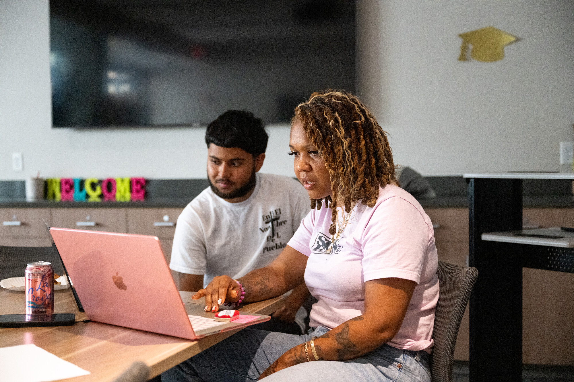 Shani Shay (right), director of Incarceration to College, works with Laney College student Bryan Minero at the program’s offices on the UC Berkeley campus on Sept. 9, 2025. The initiative supports system-impacted youth in accessing higher education. (Beth LaBerge/ KQED)