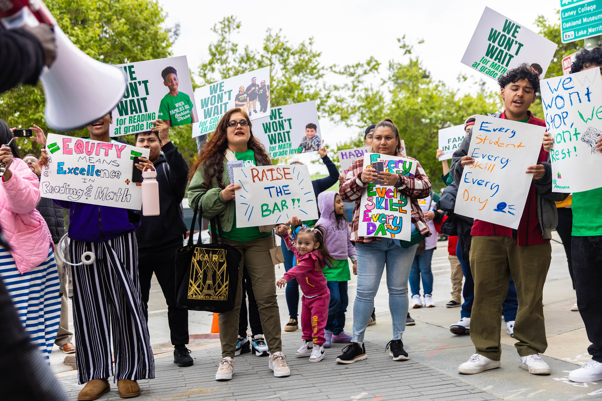 Oakland Unified School District parents, students and community leaders rally in support of improved schools, ahead of an OUSD board meeting at Metwest High School in Oakland on April 23, 2025. (Gina Castro/KQED)