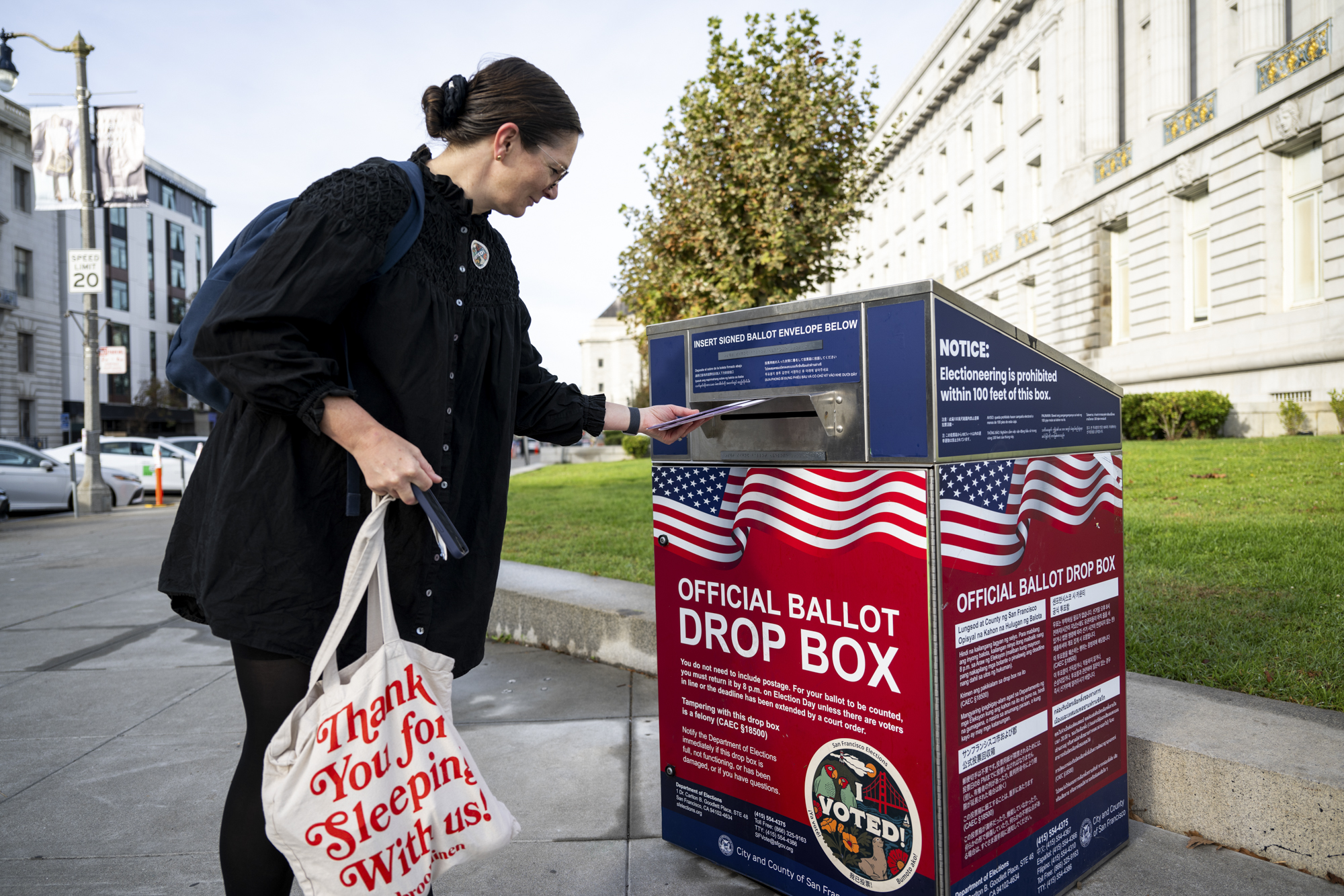 Voters drop off their ballots on Election Day at City Hall in San Francisco on Nov. 5, 2024. (Beth LaBerge/KQED)