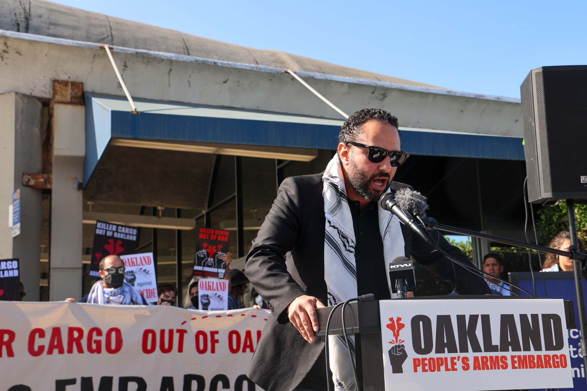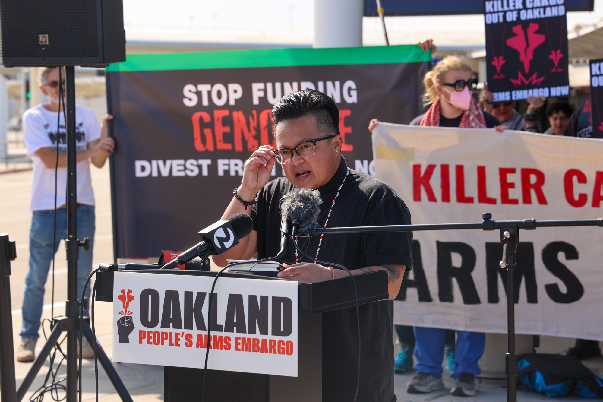“We were shocked to learn that our very own airport here in Oakland has been serving as a major hub in the supply chain of military cargo being shipped straight to Israel, military cargo that has been directly used in massacring Palestinians,” said Mohamed Shehk, with the Arab Resource and Organizing Center Action. “This is unconscionable and unacceptable.”