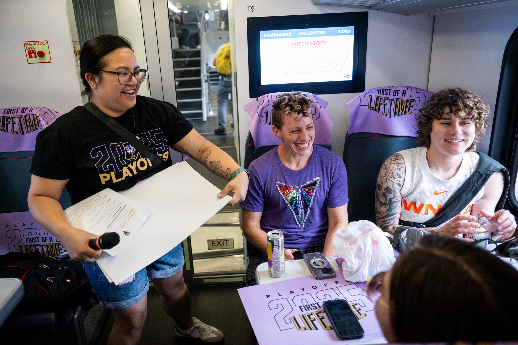Caltrain employee Emely Anne Balingit gives away swag to Golden State Valkyries fans as they ride Caltrain to the SAP Center in San José on Sept. 17, 2025, for Game 2 of the Valkyries vs. Minnesota Lynx WNBA playoff. (Beth LaBerge/KQED)