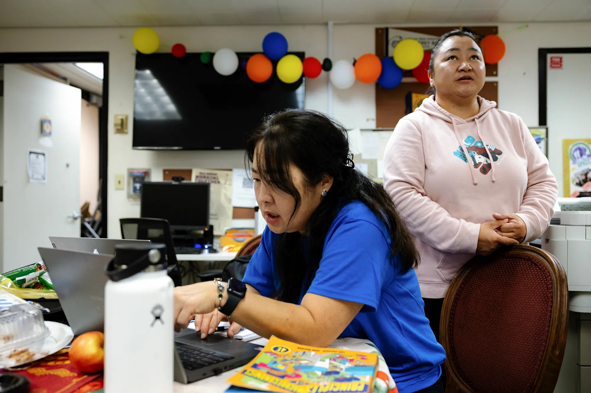 Staff assistant Huizhen Joan Su looks at student Narmandakh Suurinburneebaatar as she shows videos from a Mongolian cultural activity. Photos by Manuel Orbegozo for CalMatters