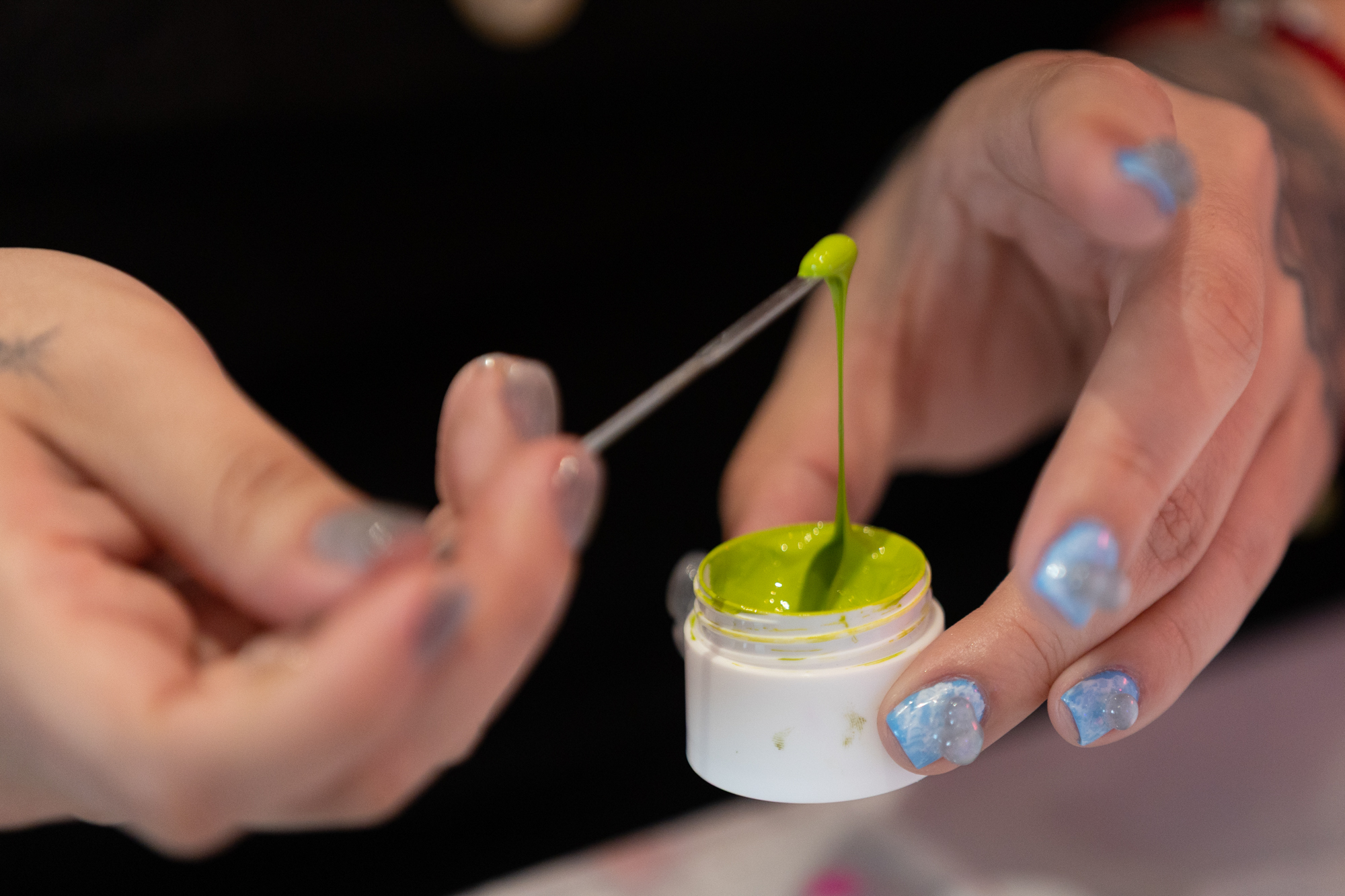 Laysa Cazares pulls gel from a container during a nail-sculpting class at Sparkle SF in San Francisco on Sept. 4, 2025. Cazares, a Hayward native, is known for her detailed, three-dimensional nail art. (Gustavo Hernandez/KQED)