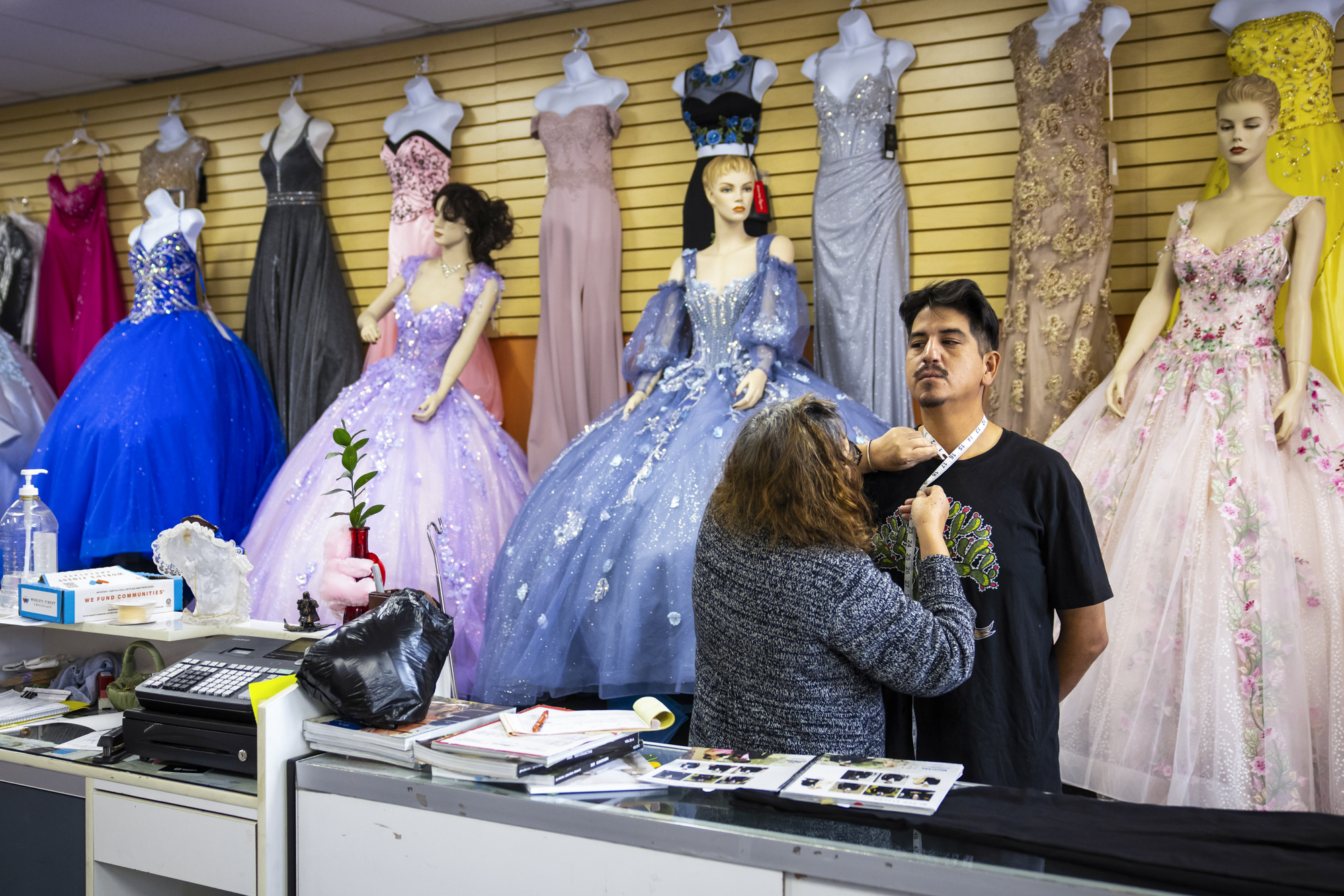 Enriqueta Soriano and her son Enrique work inside her store, El Palacio de las Novias y Quinceañeras, in the Fruitvale neighborhood in Oakland on Oct. 22, 2025. (Martin do Nascimento/KQED)
