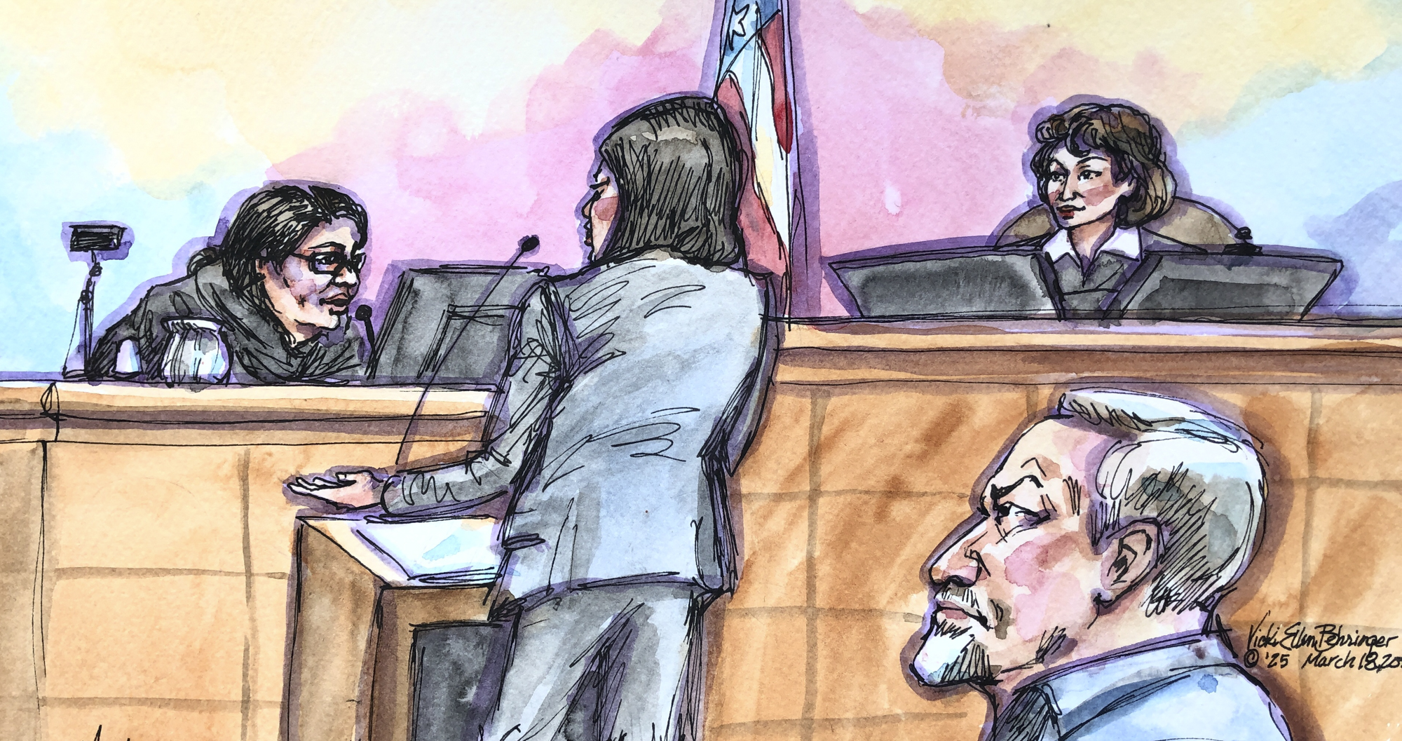 A courtroom sketch shows former FCI Dublin correctional officer Darrell Wayne Smith, right, listening as a witness testifies in federal court in Oakland on March 18, 2025. (Vicki Behringer for KQED)