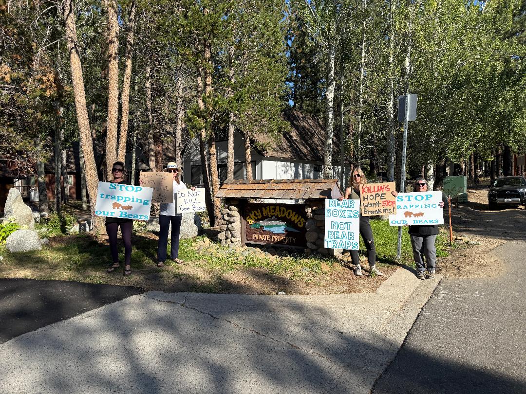 A BEAR League protest in September 2025 to stop the California Department of Fish and Wildlife from trapping Hope and Bounce, two black bears. (Courtesy of the BEAR League)