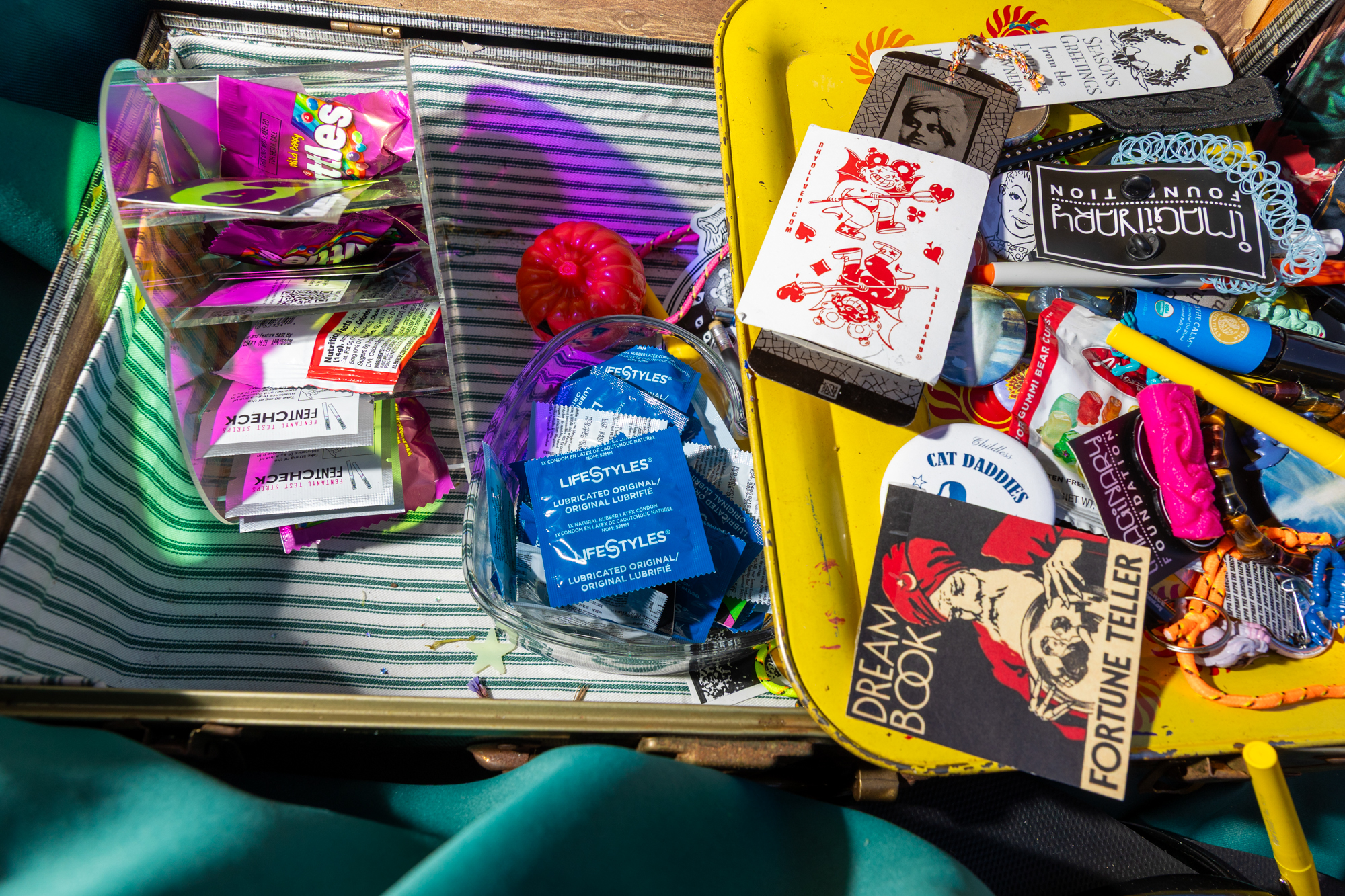 A wagon houses Creative Mutual Aid’s, “Free Mall” full of trinkets, condoms, and fentanyl testing strips at the Conservatory of Flowers in San Francisco on Aug. 31, 2025. Creative Mutual Aid, a group of Sara Rubenstein and Joe Mitchell, aims to bring mutual aid to San Francisco parks, whether it’s through free trinkets or providing household items. (Tâm Vũ/KQED)