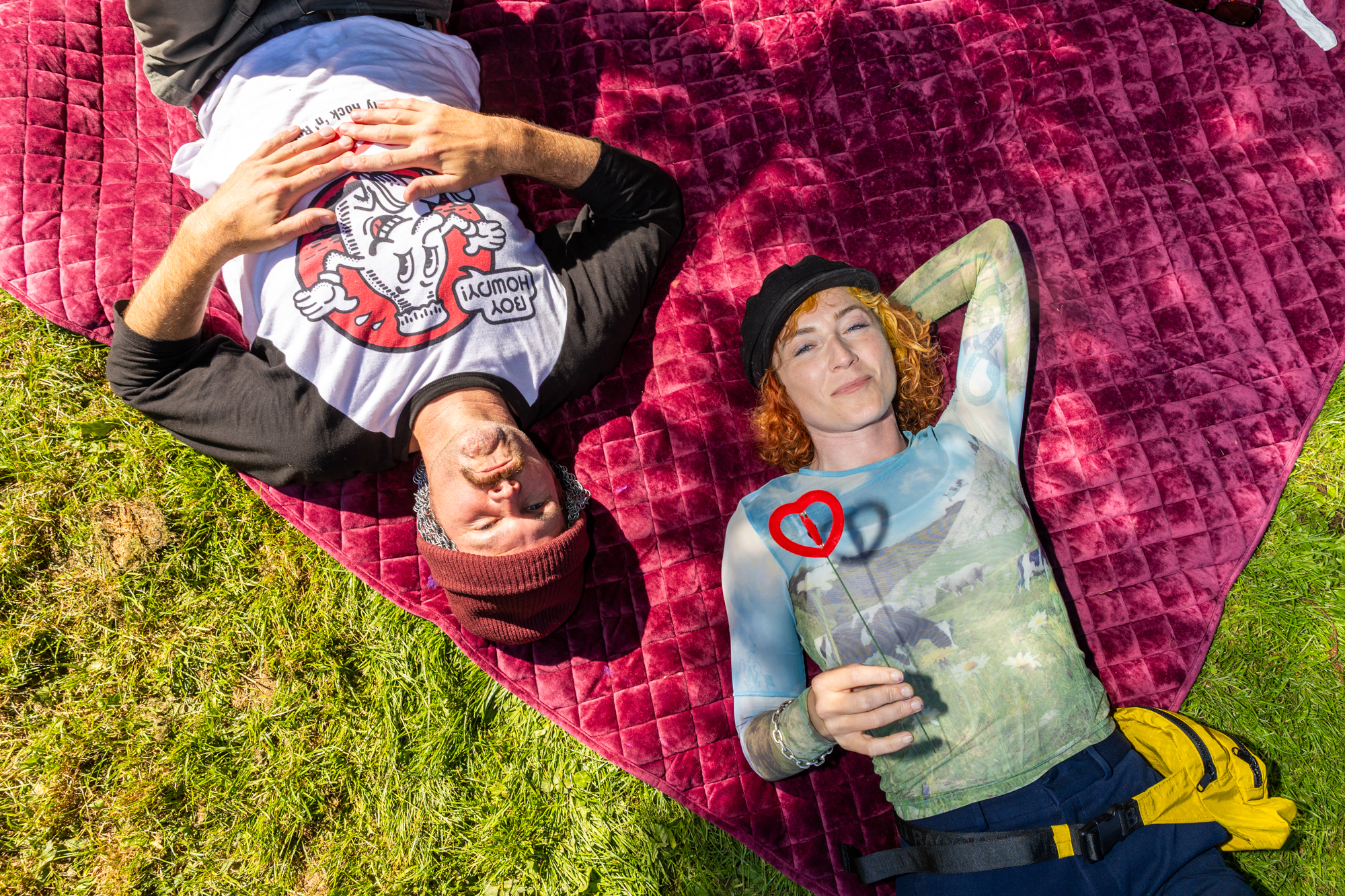 Joe Mitchell (left) and Sara Rubenstein (right) pose for a portrait at their tabling session for Creative Mutual Aid at the Conservatory of Flowers in San Francisco on Aug. 31, 2025. Creative Mutual Aid, a group of Sara Rubenstein and Joe Mitchell, aims to bring mutual aid to San Francisco parks whether it’s through free trinkets, or providing household items. (Tâm Vũ/KQED)