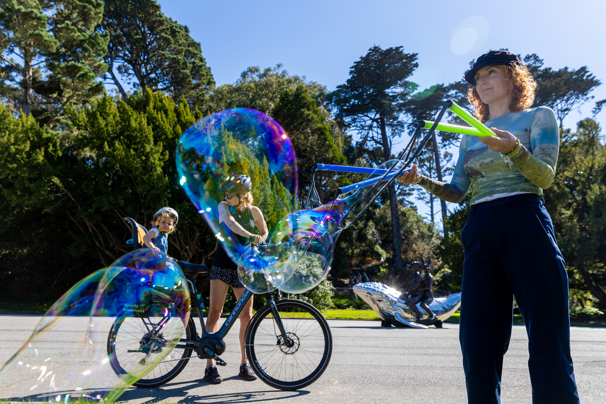 Sara Rubenstein makes bubbles at the Conservatory of Flowers in San Francisco on Aug. 31, 2025. Creative Mutual Aid, a group of Sara Rubenstein and Joe Mitchell, aims to bring mutual aid to San Francisco parks whether it’s through free trinkets, or providing household items. (Tâm Vũ/KQED)