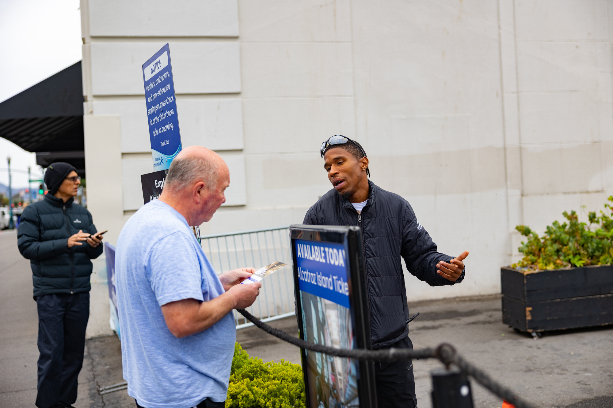 A security guard informs a tourist that Alcatraz Island is closed Oct. 1, citing closure due to a planned project, on October 1, 2025. (Gina Castro/KQED)