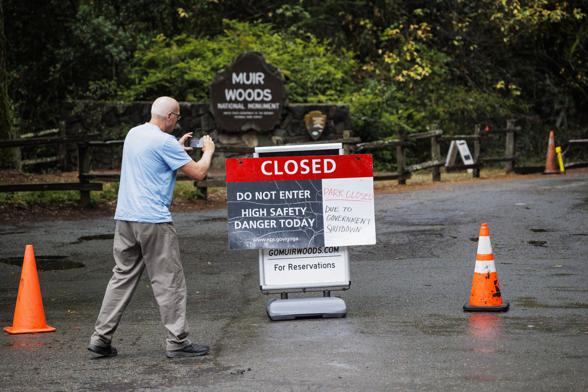 A visitor takes a photos of a sign indicating that Muir Woods National Monument in Marin County, CA is closed as a consequence of the government shutdown on Oct. 1, 2025. (Martin do Nascimento/KQED)
