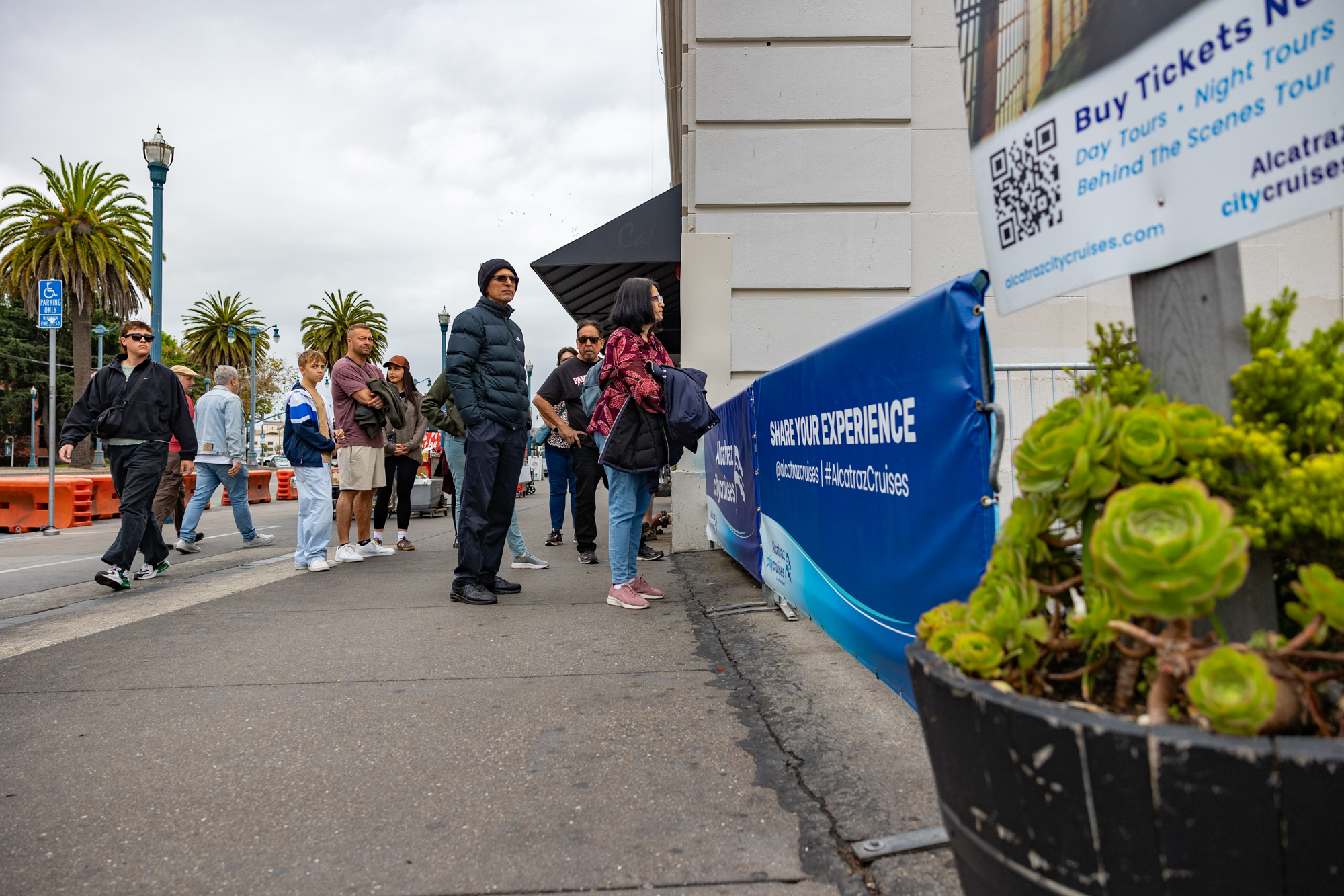 Tourists wait around Pier 33 at the Alcatraz Ferry landing on Oct. 1, 2025. (Gina Castro/KQED)